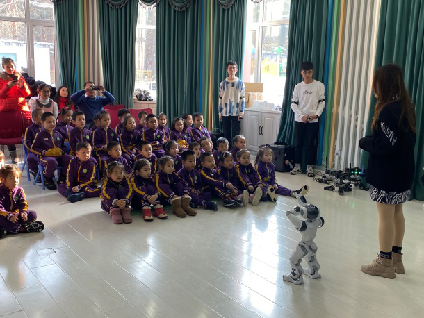 接下来看一看NAO机器人吧,它跳起了优美的舞蹈,舞姿很有力量。小朋友们,你们知道吗?在疫情期间,NAO机器人可是做出了很大的贡献,医生叔叔阿姨们在一线奋斗,防疫工作又需要好多人,处境十分危险,我们的NAO机器人就承担了在医院里进行消毒的工作;还有配送物资、药品、防护用品、安防巡逻等等,我们要学习机器人的抗疫精神,做一名勇敢的小朋友。