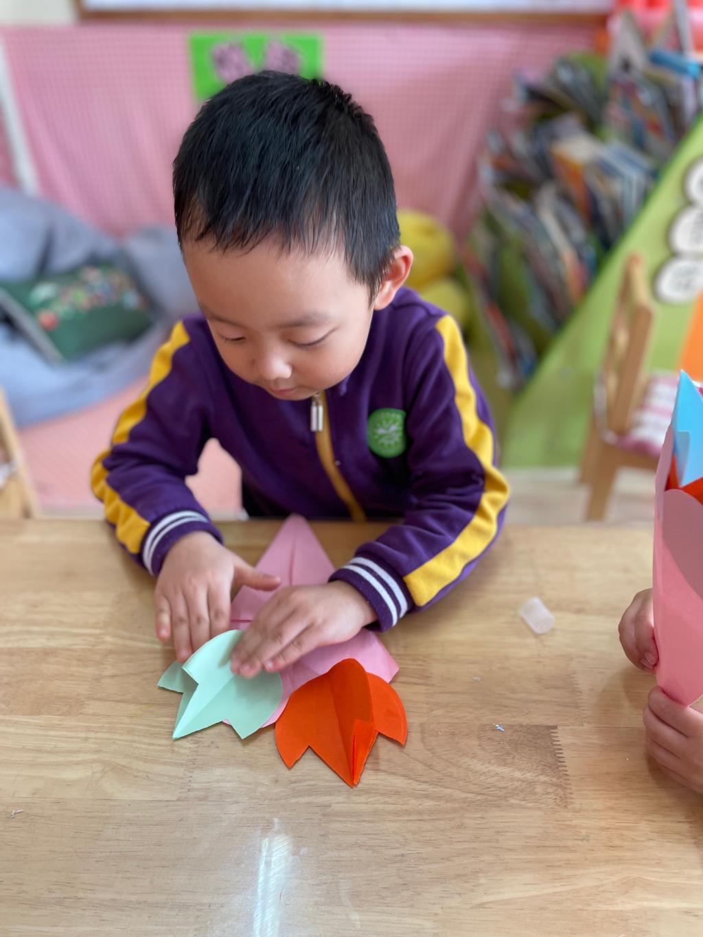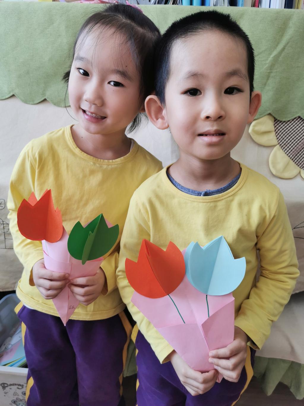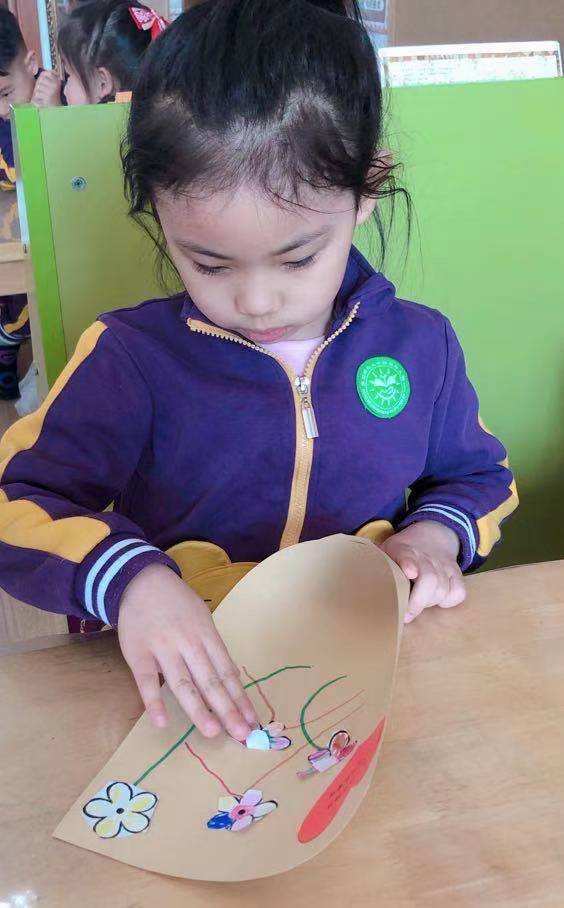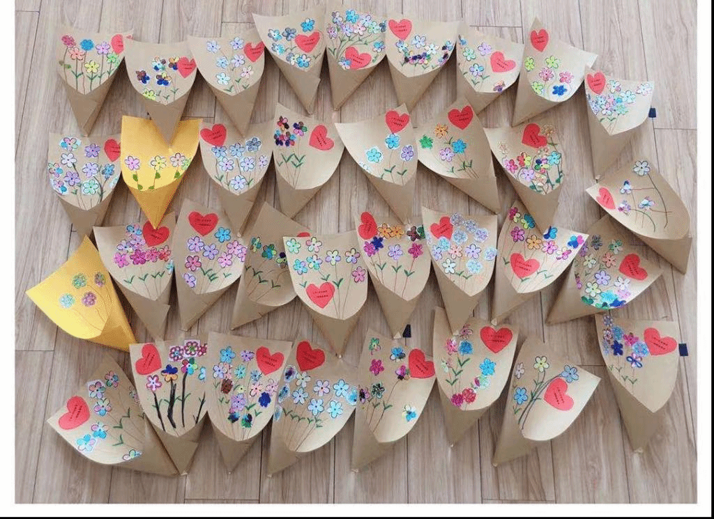 朵朵二班的小朋友通过剪纸、粘贴等方式,制作了郁金香花束,馨香扑鼻的郁金香,就像每一位伟大的母亲,孩子们用这束花表达对妈妈的爱。