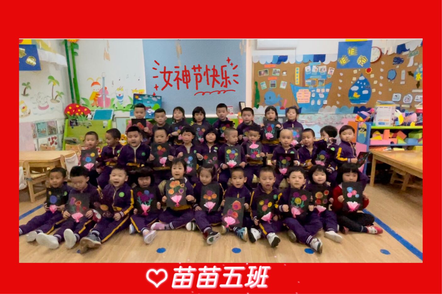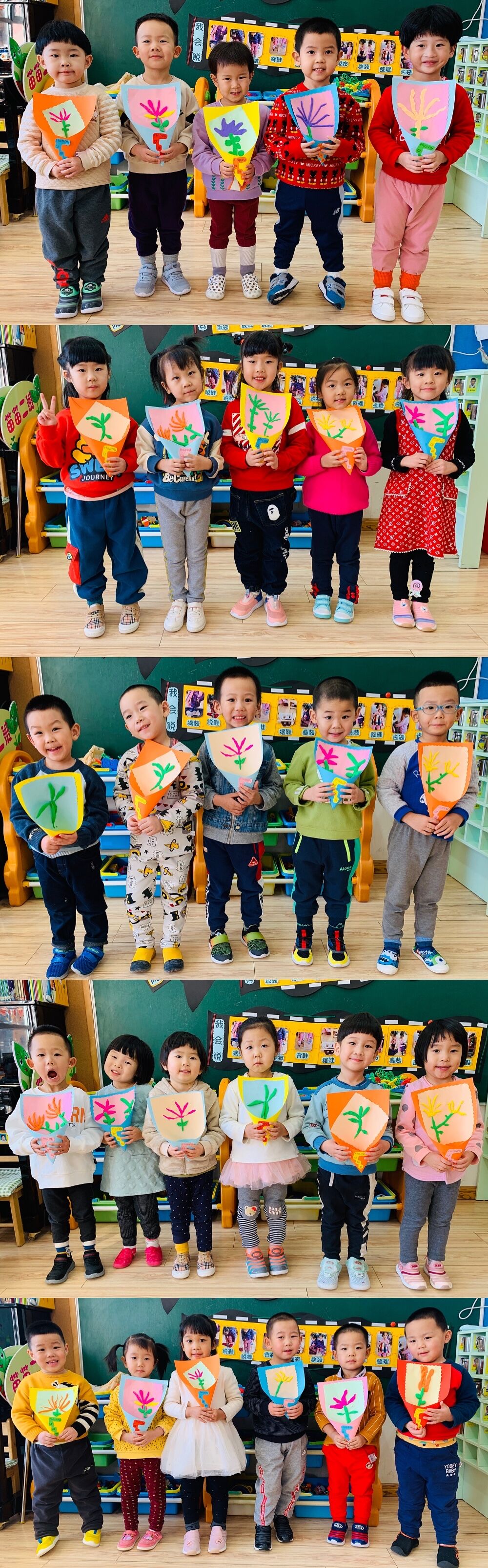 郁金香花代表爱与祝福,苗苗一班将满满的爱与祝福送给亲爱的妈妈和老师,祝福她们幸福快乐。