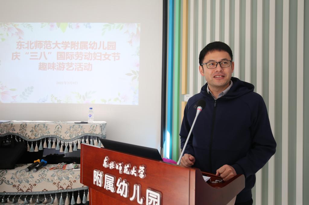 我园直属党支部张泽东书记代表园领导为节日活动致词。首先,张书记代表园领导向全体女教职工给予节日的祝福。他在讲述了“三八”国际劳动妇女节和东师附幼的发展史后表示,在东师附幼辉煌的历史中,历届女性园长都留下了浓墨重彩的一笔。张书记在与大家分享诗歌《淡雅的女人》的同时,希望全体女教职工发扬东师附幼人“有爱心、大胸怀、善思考、求卓越”的精神,做一名从容、淡雅而又优雅的人。