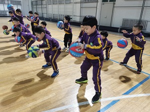 马老师为小朋友们讲解了玩转篮球的技巧。怎样才能拿稳球,怎样左右手控球,篮球小将们全神贯注的观察动作。