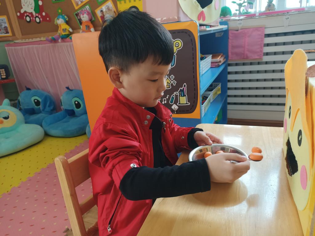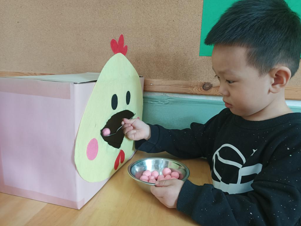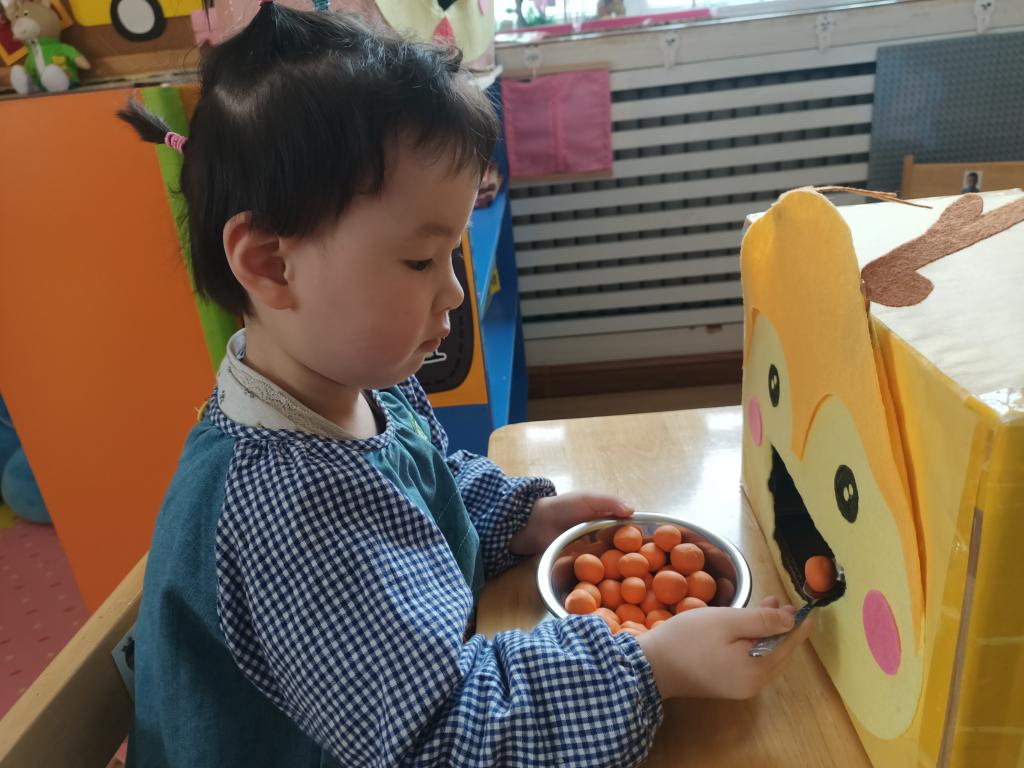 手指的精细动作发展有利于动作技能的发展和脑的发育,也会积极促进未来的学习成绩以及个体神经系统的发展。豆豆四班的小朋友都可以自己吃饭啦,只是一部分小朋友握勺时还在使用“手掌式抓握”,我们设计了游戏“喂喂小动物”,帮助小朋友练习“三指握勺”的方式。