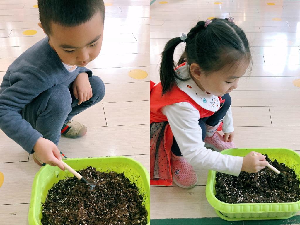 小朋友们亲自把手中的种子播种到属于自己的“小花盆”中。他们在温暖的阳光下小心翼翼的播种下属于自己的种子。
