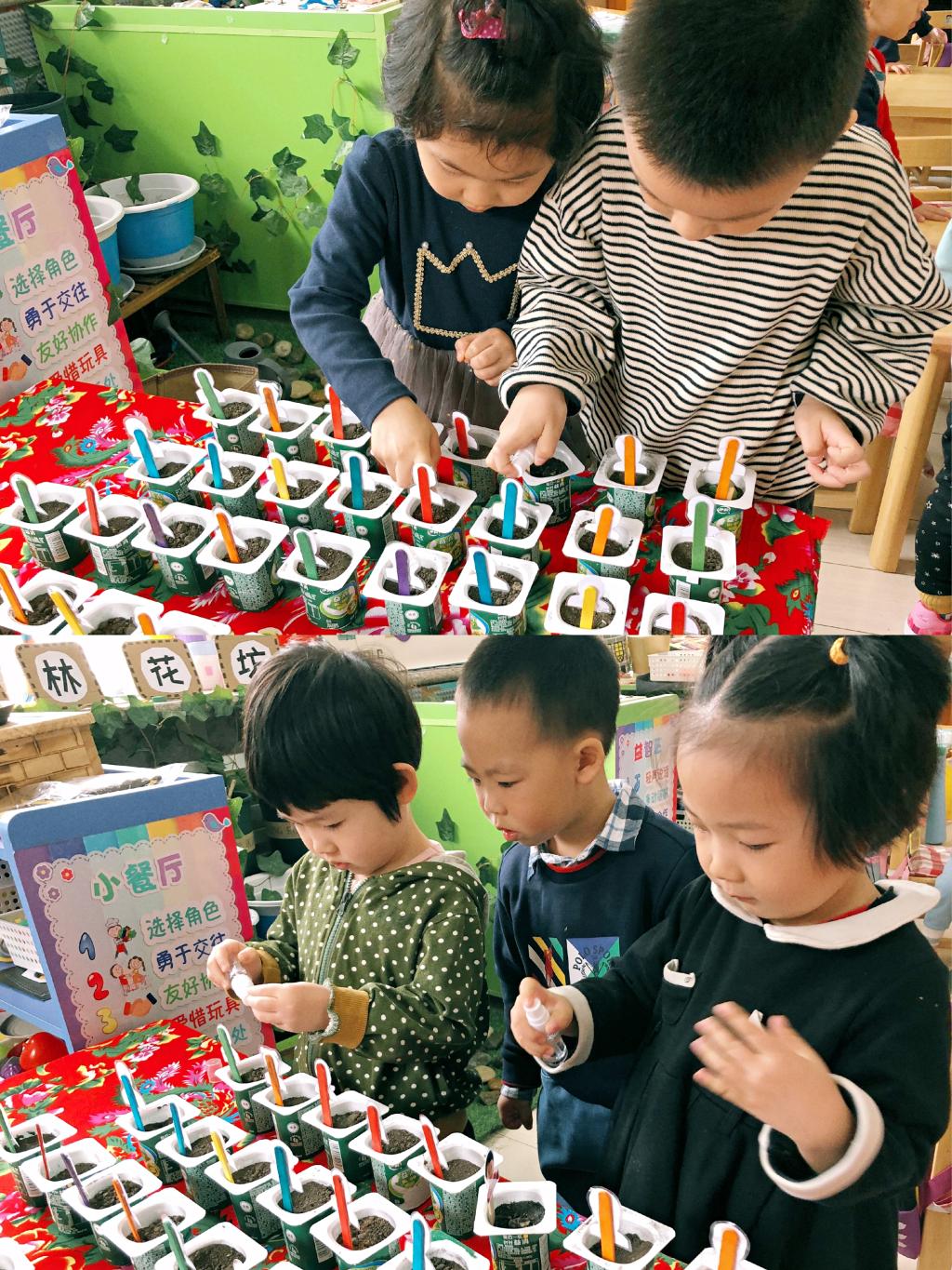 今日苗苗四班的小朋友们播种了各种各样的种子,相信也在他们的心中播种了希望的种子。自此以后,他们会不断地观察、浇水,等待种子出芽的那一天。让我们细心呵护、静等芽绿苗长。