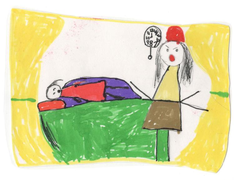 “要是七点了我还没有起床,迟到了妈妈就火冒三丈啦!你看妈妈的眉毛,就是生气啦!”