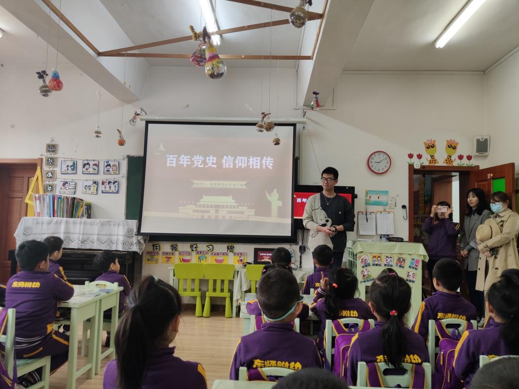 ,传承革命先烈的红色精神”是时代的要求,也是教师、家长、幼儿共同的责任,我们邀请到东北师范大学马克思主义学部党委副书记潘宛莹老师(李菁祺妈妈)、马克思主义学部孟鑫、刘子睿同学来到幼儿园为小朋友们讲述党史故事。