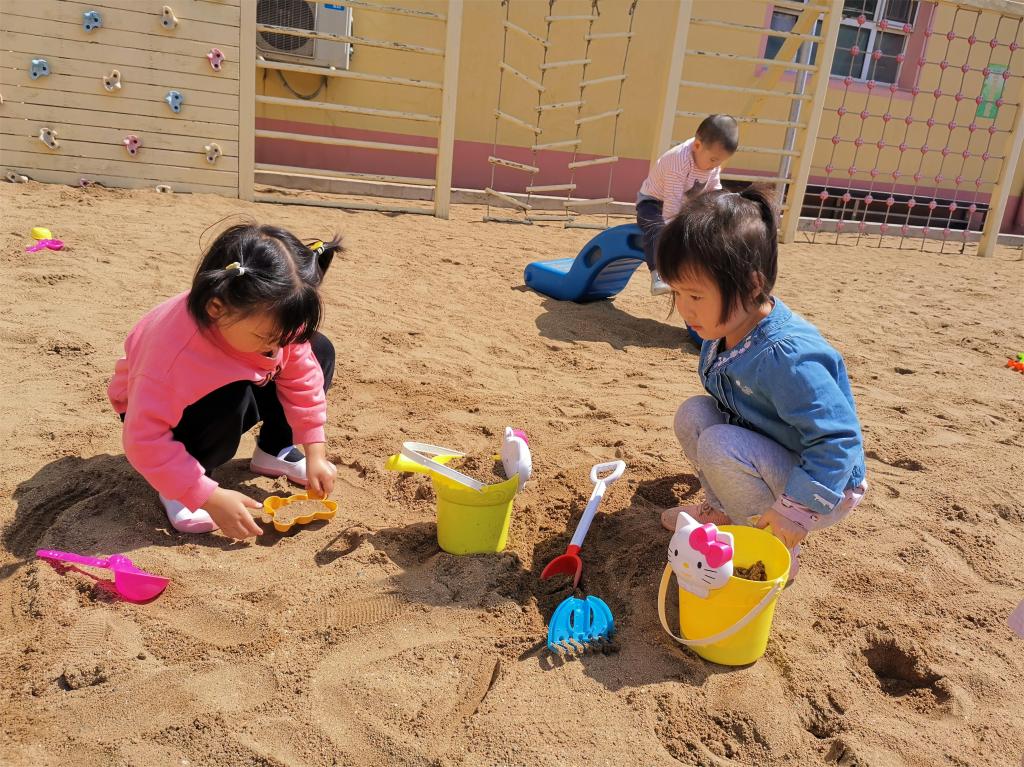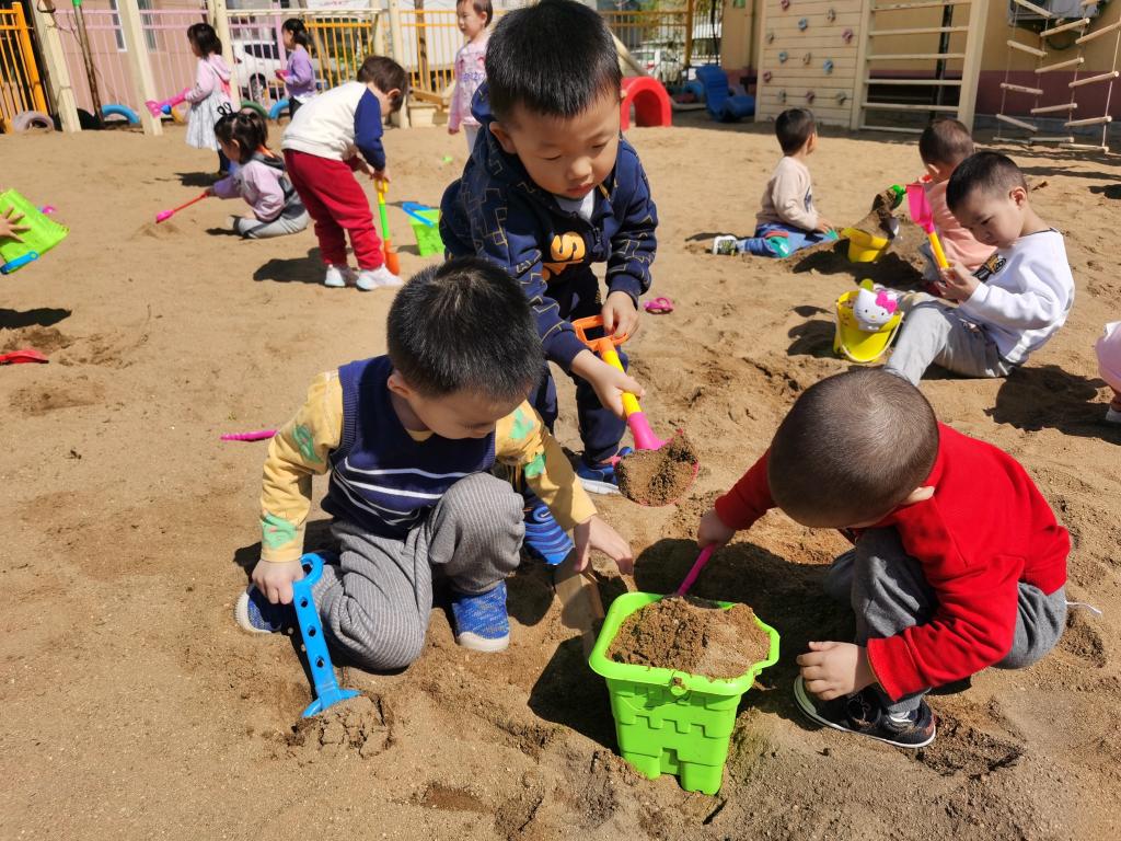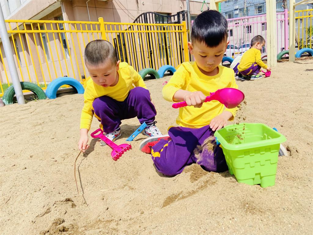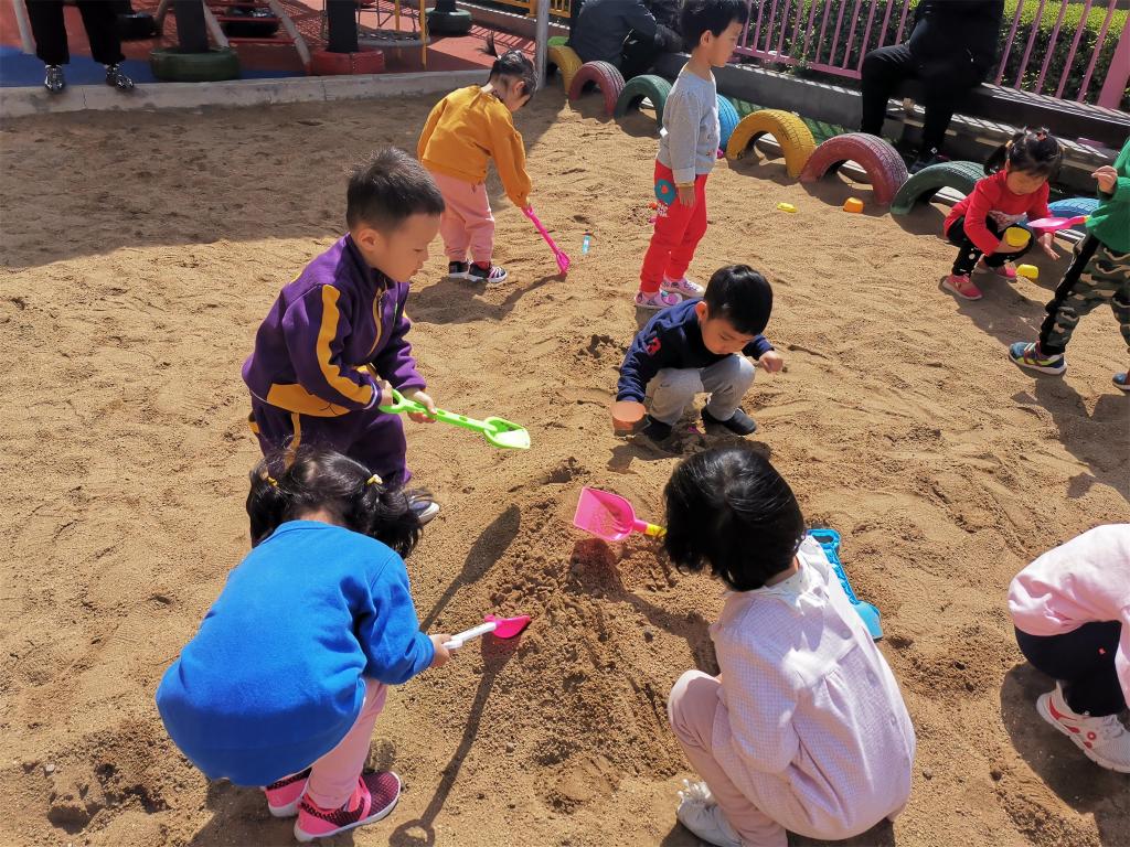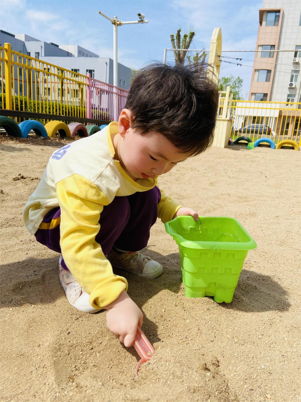 宝贝们有的在堆沙、有的在挖沙、有的在盛沙、有的在“寻宝”...在玩沙的游戏中,他们通过自己的想象进行各种建构和构想,兴趣得到了满足,积极性、主动性、创造性得到充分发挥。