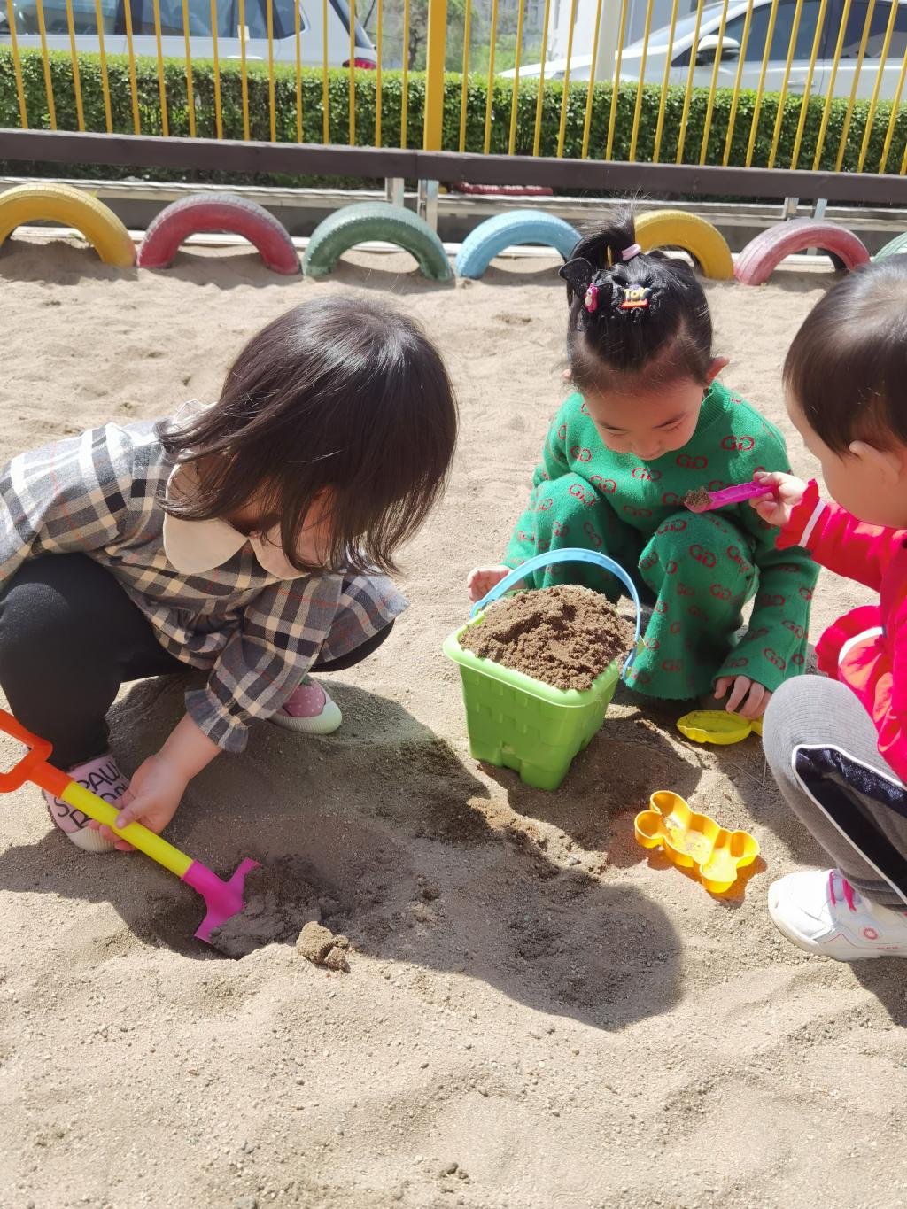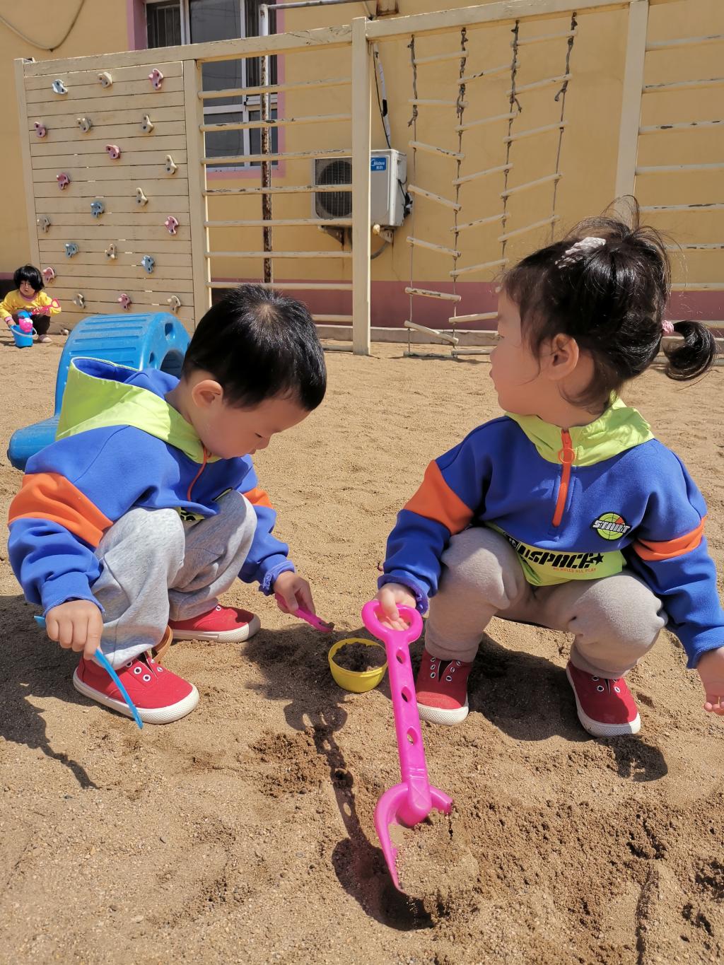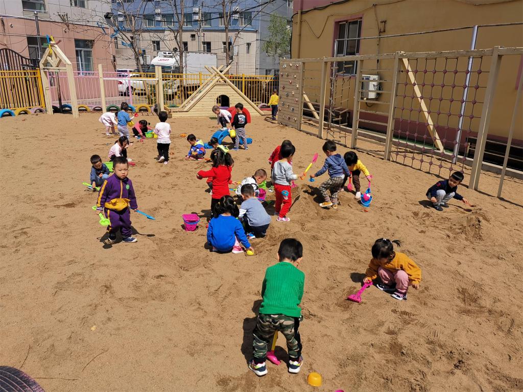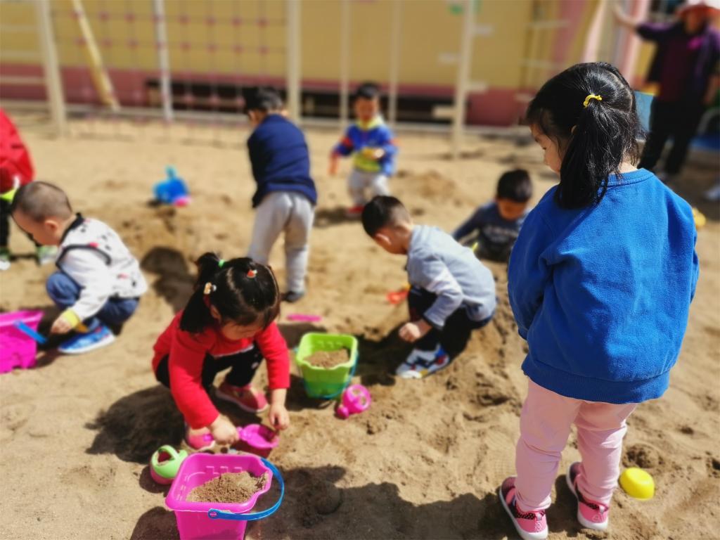 宝贝们有的在堆沙、有的在挖沙、有的在盛沙、有的在“寻宝”...在玩沙的游戏中,他们通过自己的想象进行各种建构和构想,兴趣得到了满足,积极性、主动性、创造性得到充分发挥。