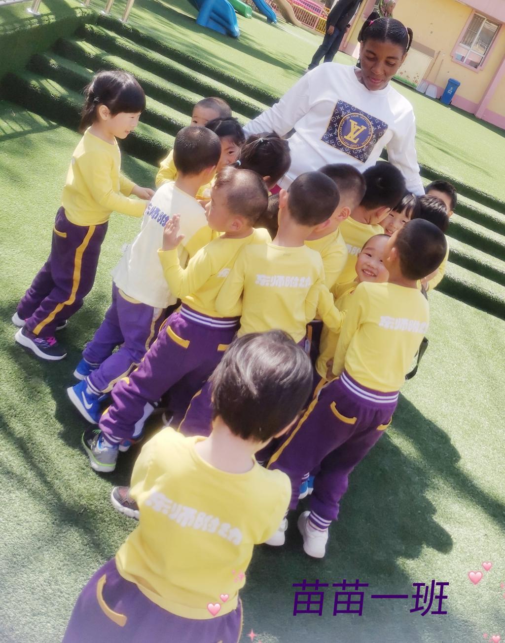 “一、二、三……”瞧,苗苗六班的小朋友正在和外国友人比赛踢口袋。