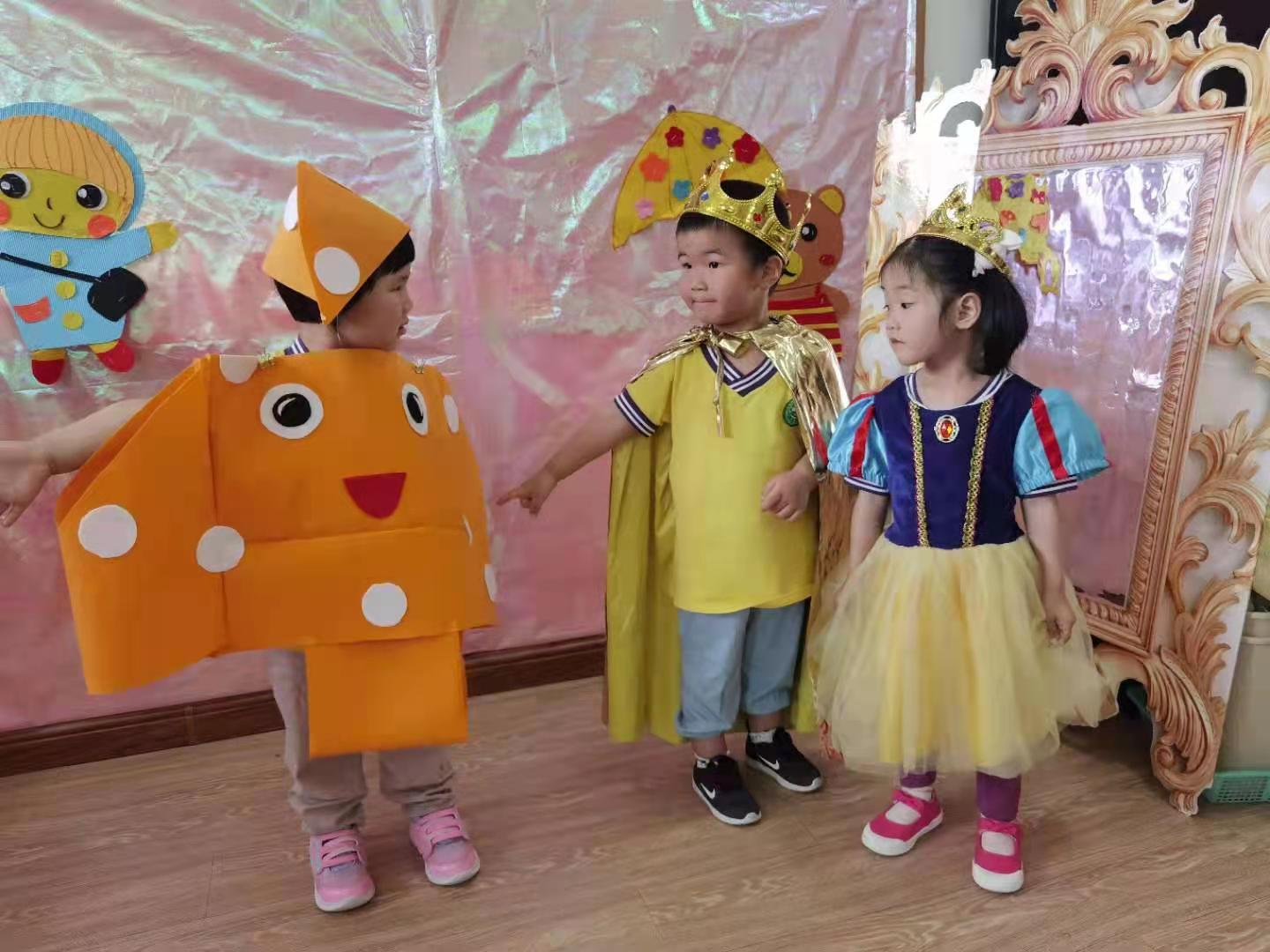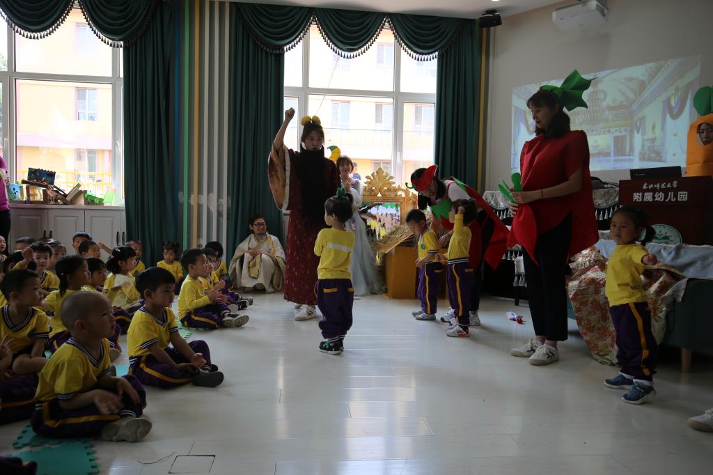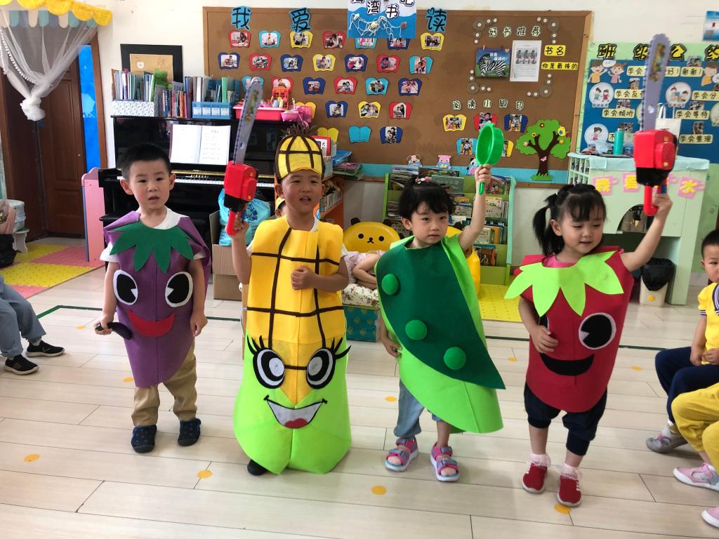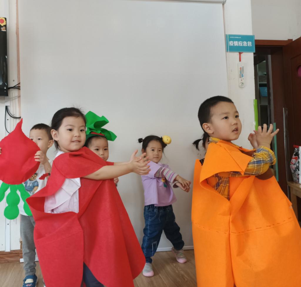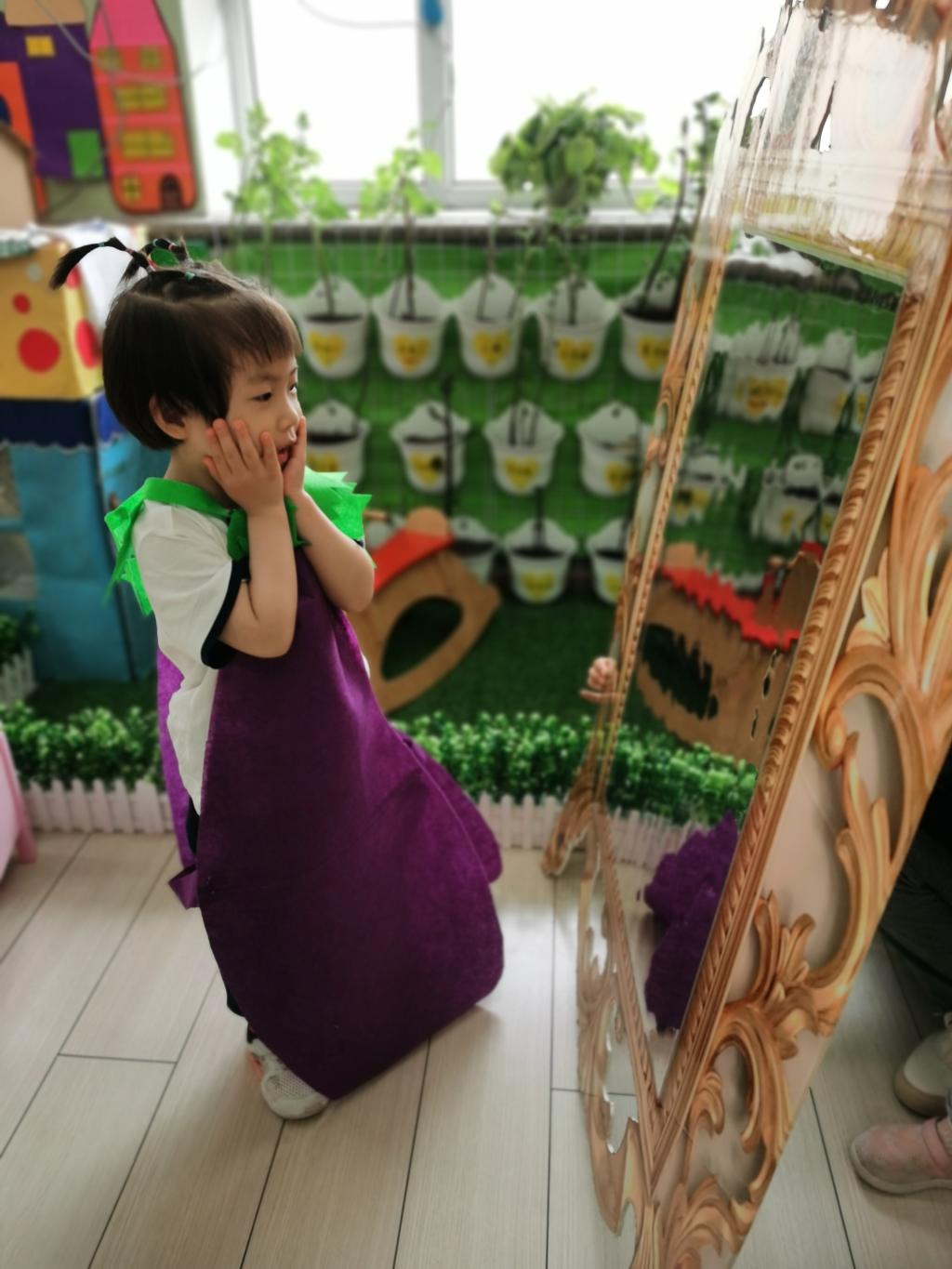 还穿上自己喜欢的服装,有的扮演月亮公主,有的扮演茄子皇后,有的扮演蔬菜超人……自己模仿着,自由发挥进行表演。在表演中,小朋友们发挥了自己的想象力,更加丰富了故事情节以及角色形象。充分展现了孩子们的创造力。