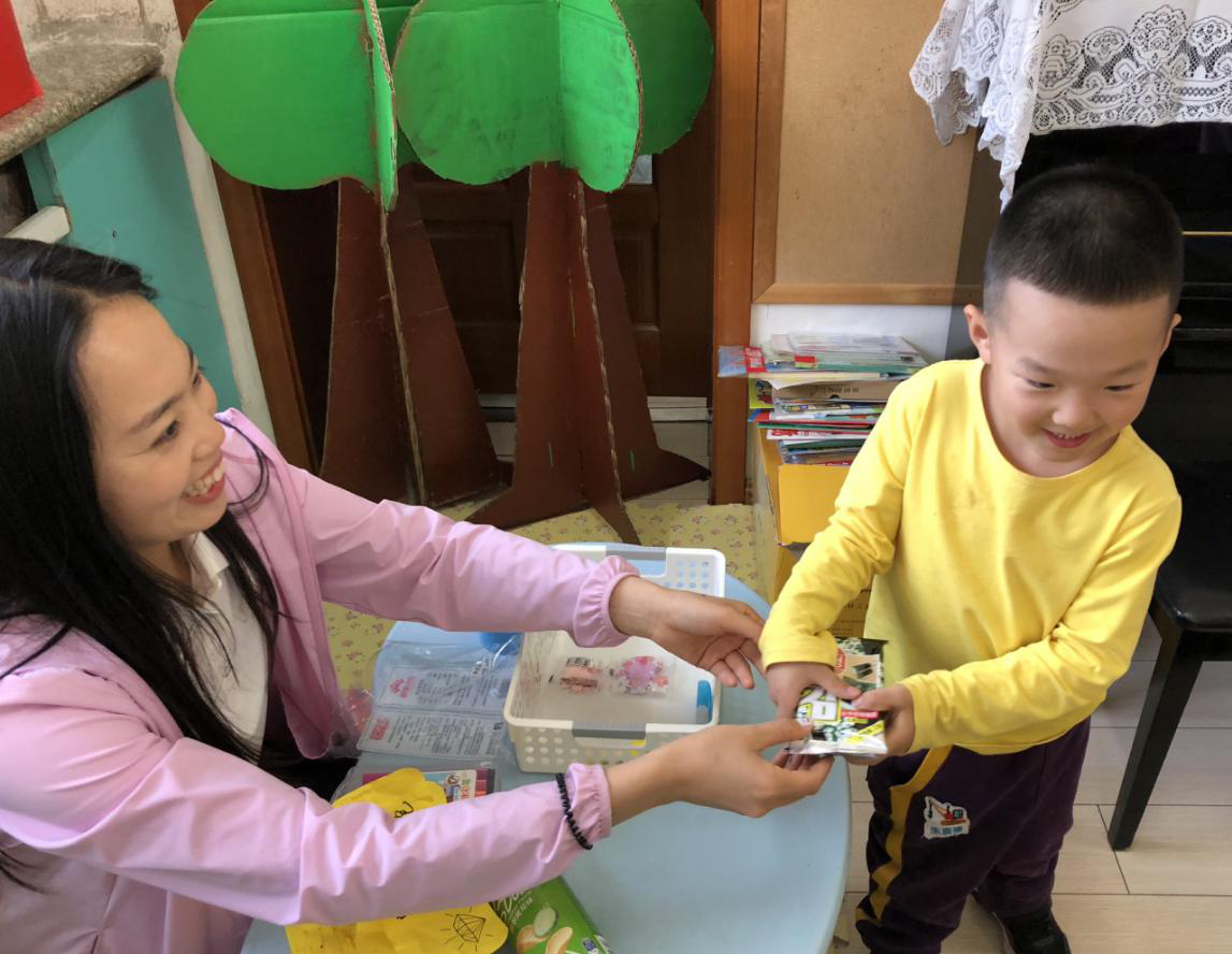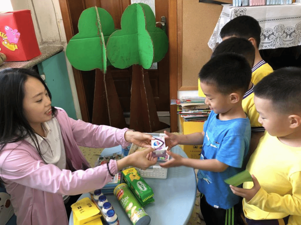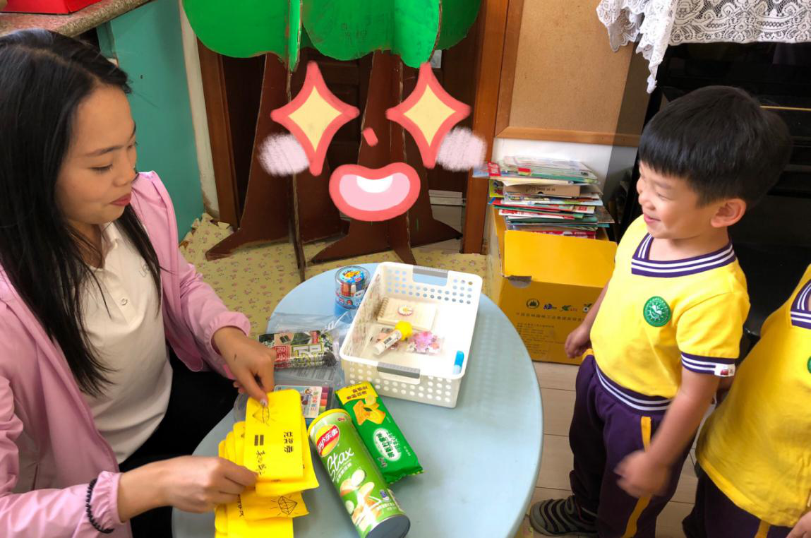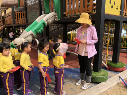 小朋友们有序的排队,向“检票员”出示自己的入场券后进入寻宝等待区。