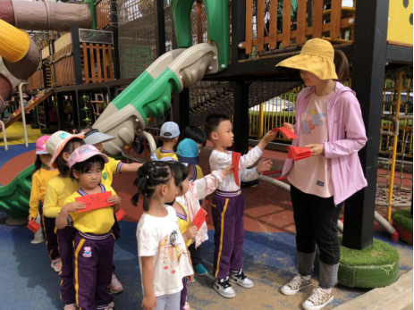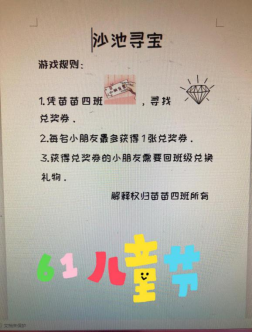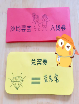 为了让小朋友们感受到寻宝的惊喜,老师们提前准备了入场券、兑奖券和礼物并提前把兑奖券埋在沙池里。