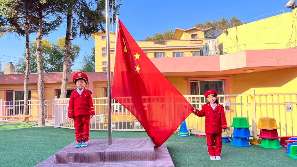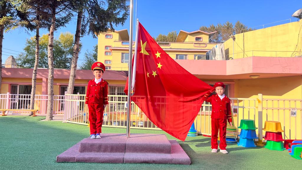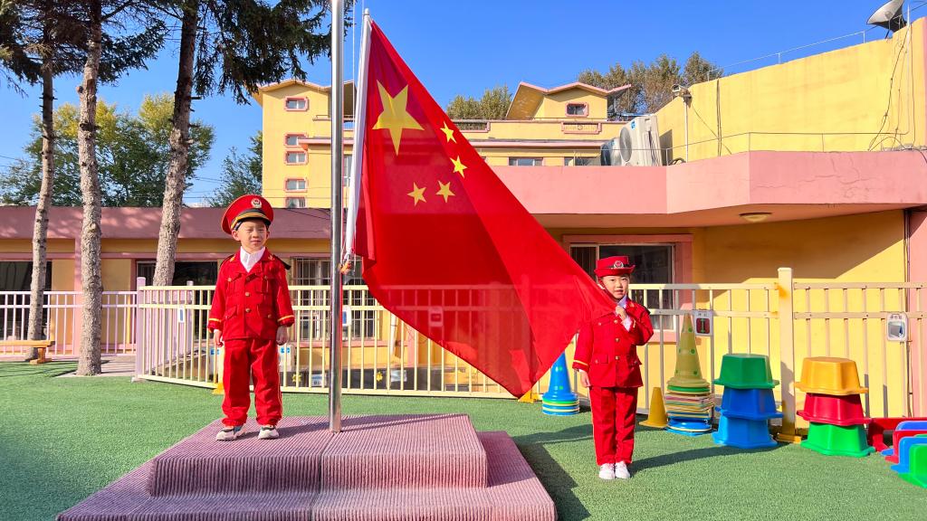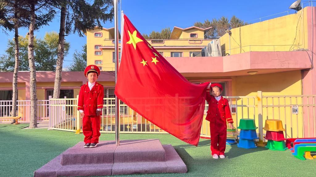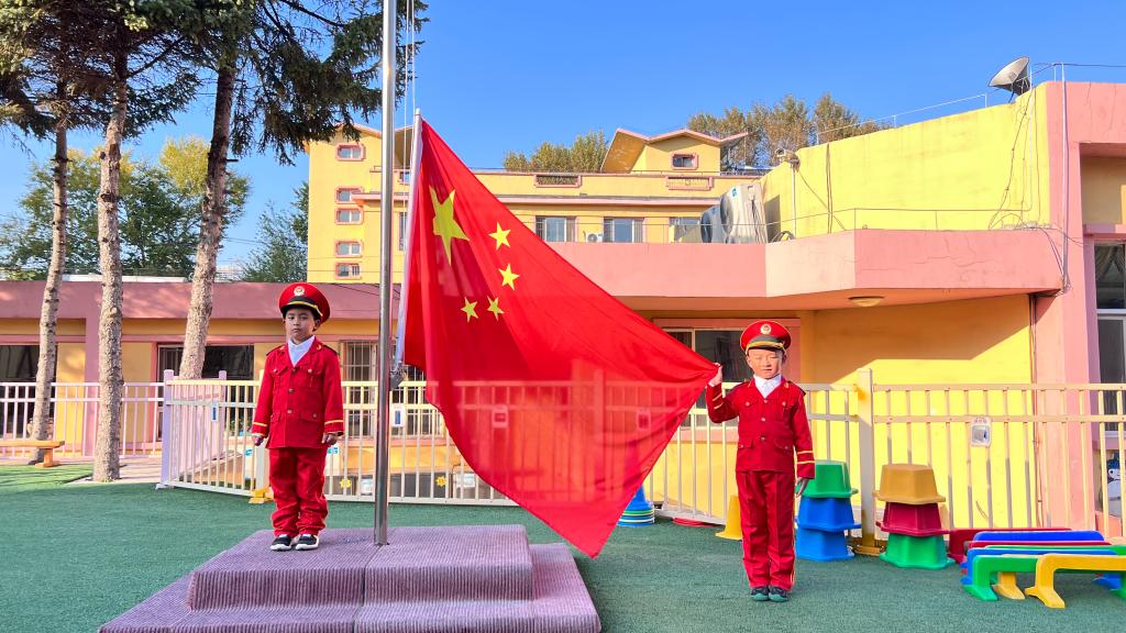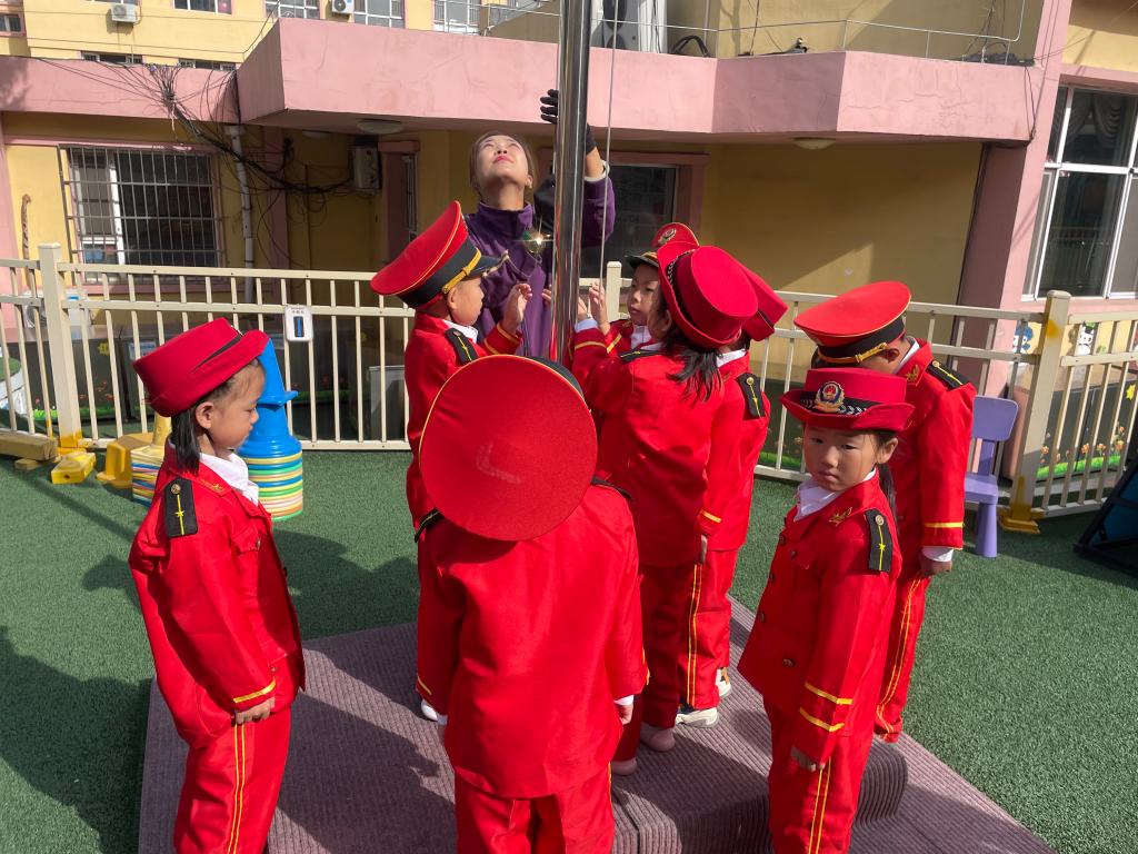 嘹亮的国歌响起,鲜艳的五星红旗升起,老师幼儿共同仰望,心向国旗,行注目礼。孩子们用稚嫩的童声唱响国歌,用坚定的眼神望着冉冉升起的五星红旗,祖国的花朵正在悄然绽放。