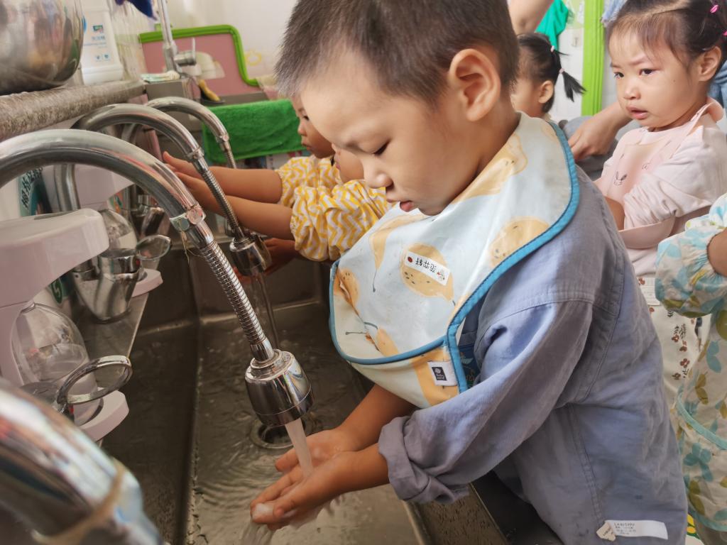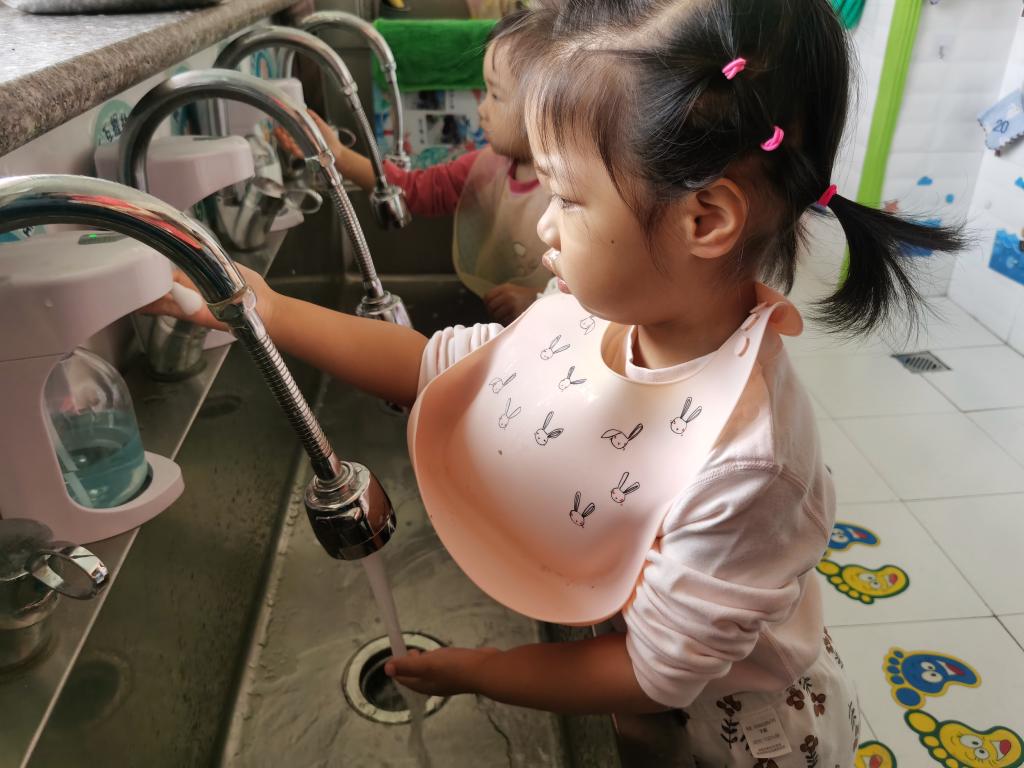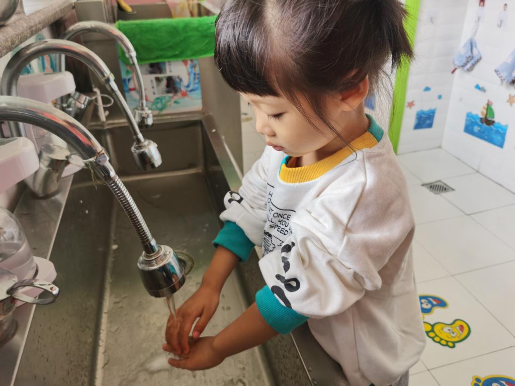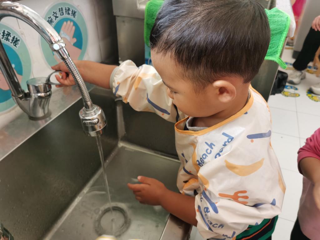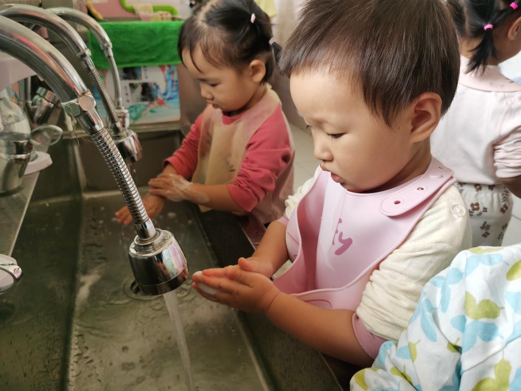 在吃饭前利用“七步洗手法”把我们的小手洗干净。