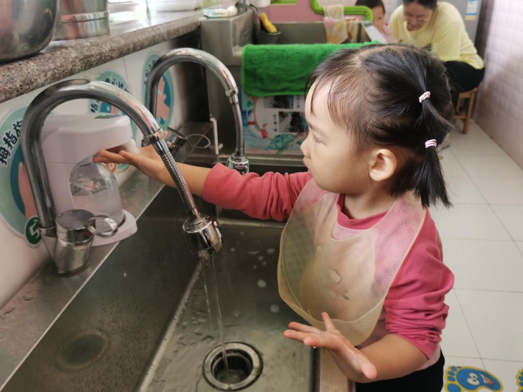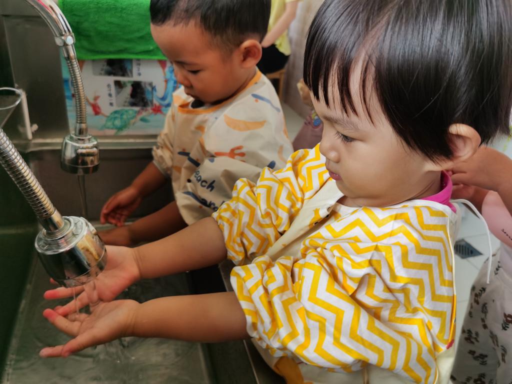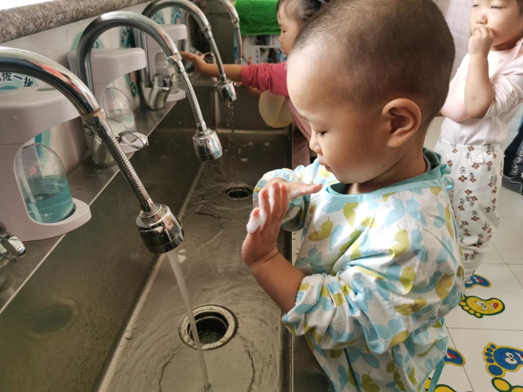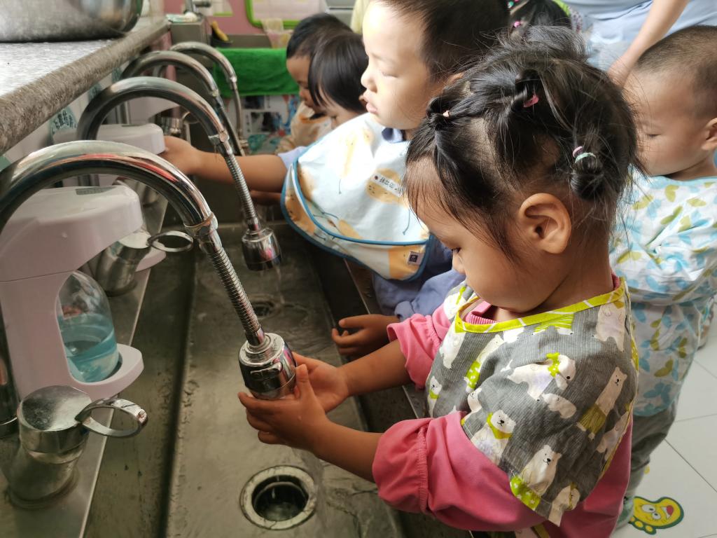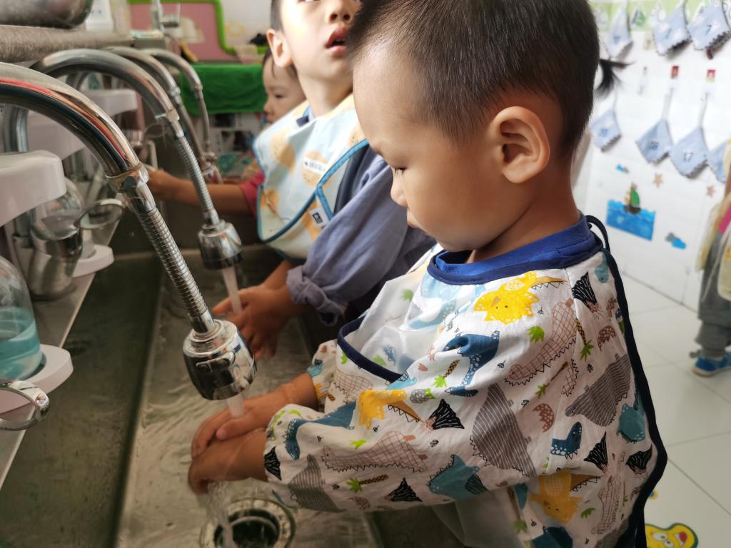 在吃饭前利用“七步洗手法”把我们的小手洗干净。