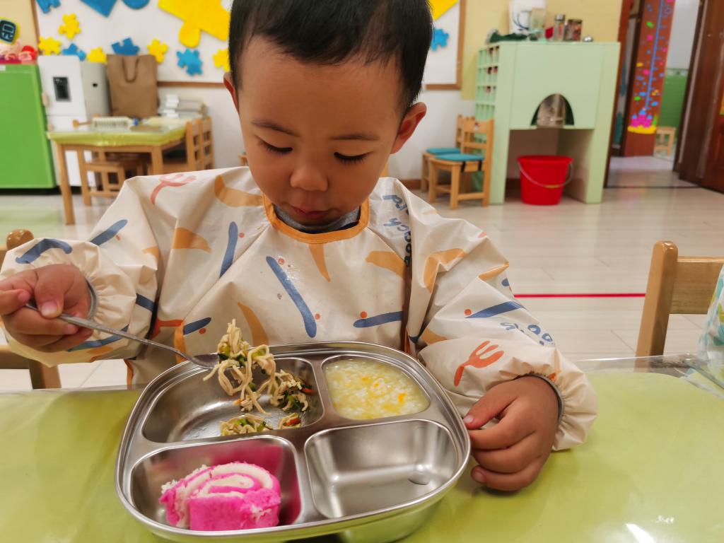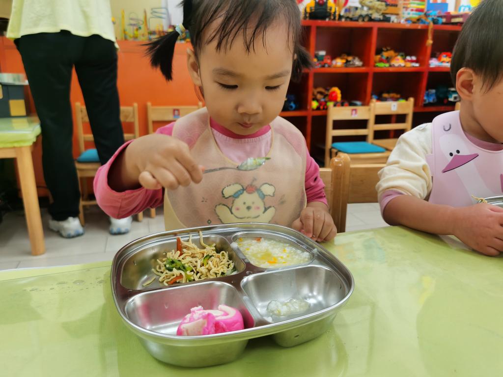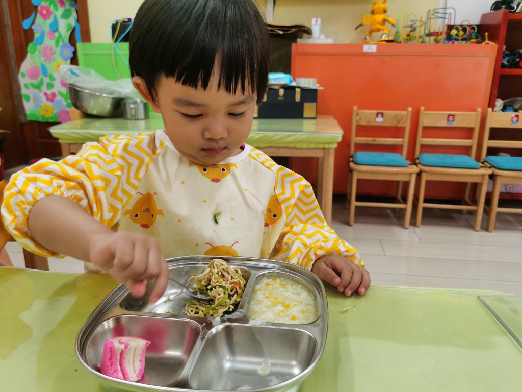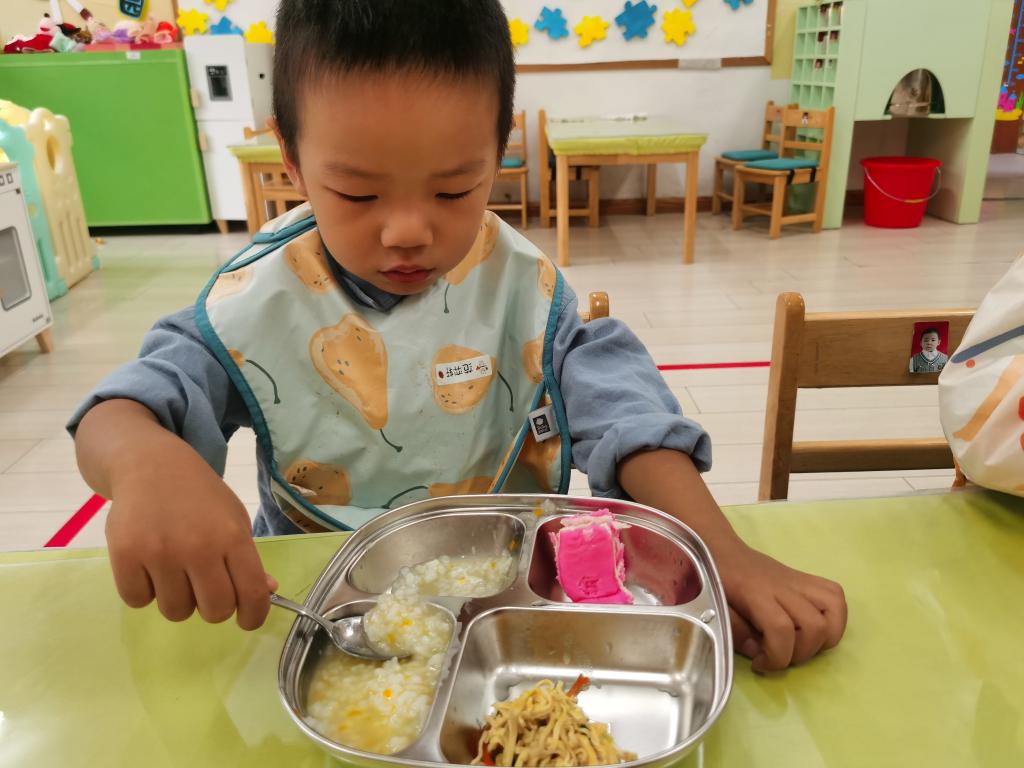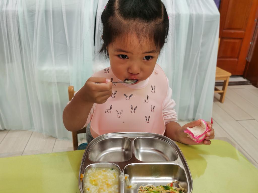 知道一只手拿勺子,一只手扶餐盘,安静地的自己吃饭。