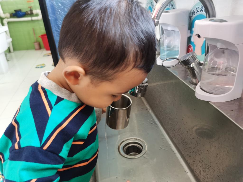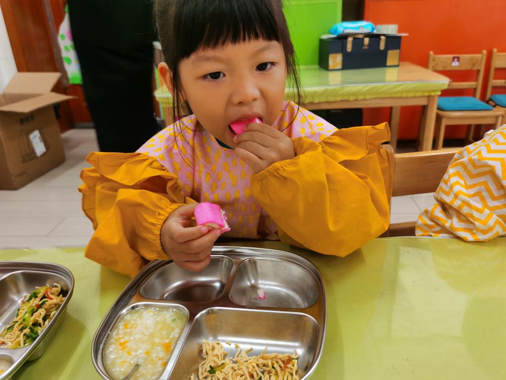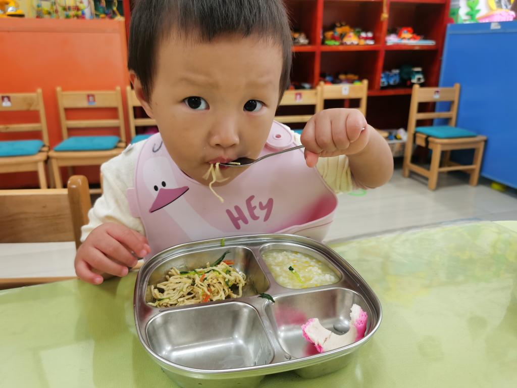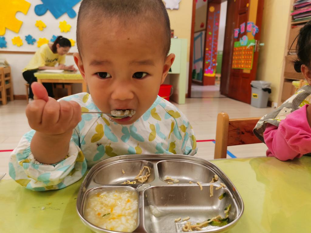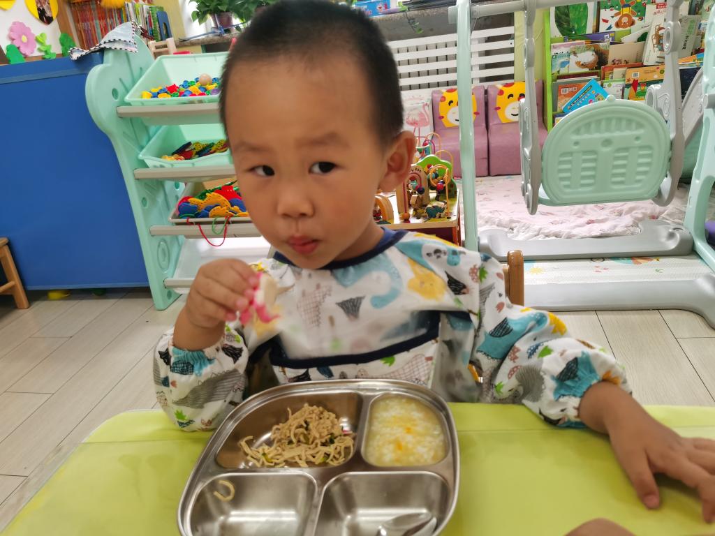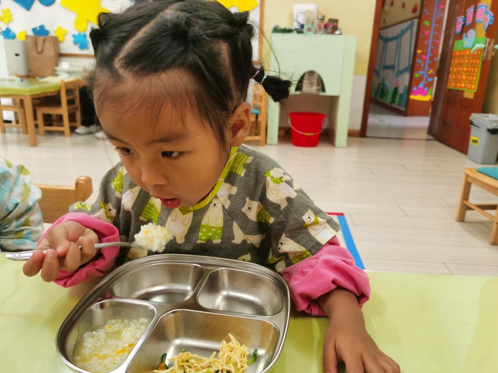 知道一只手拿勺子,一只手扶餐盘,安静地的自己吃饭。