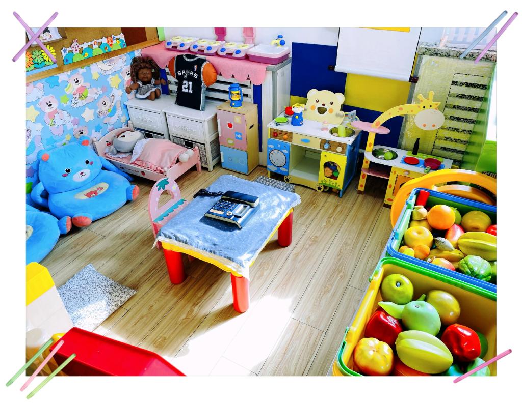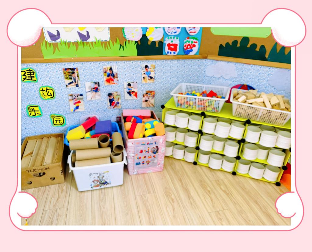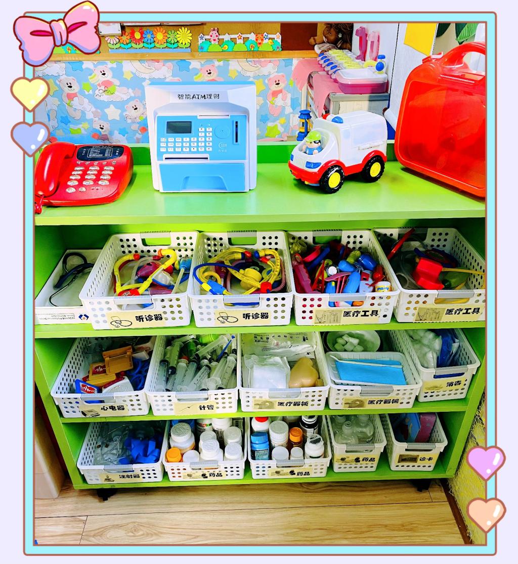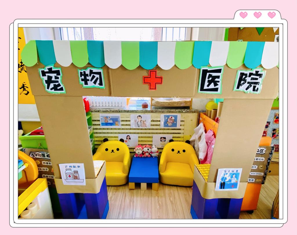 我们根据小班幼儿年龄特点和孩子们的兴趣爱好,有效地利用现有空间及废旧材料,为幼儿创设了建构区、益智区、图书区、美工区、娃娃家、医院区等活动区域。