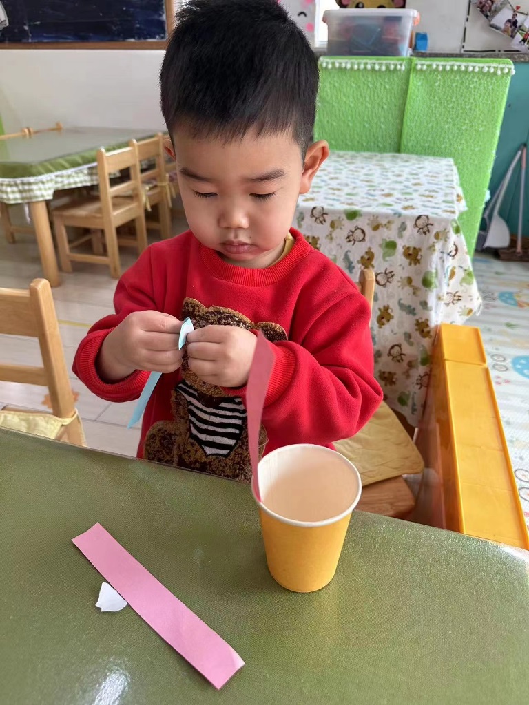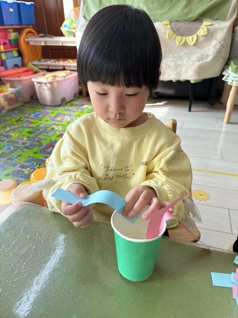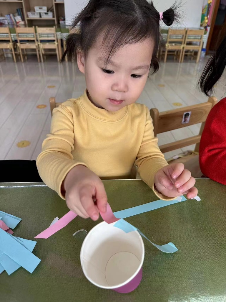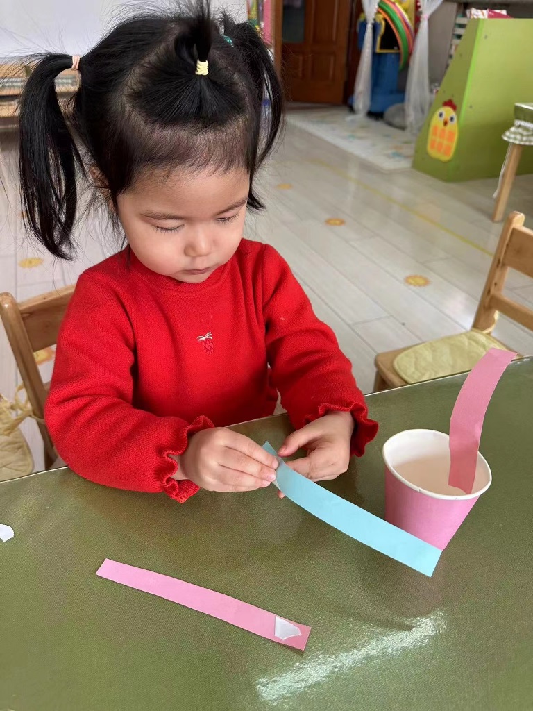 区域材料中还有彩色纸条和纸杯,将纸条一端的双面胶摘下,粘贴在纸杯的内壁,这样一朵漂亮的纸杯花就做好啦!丰富班级环创作品,宝贝们真棒!