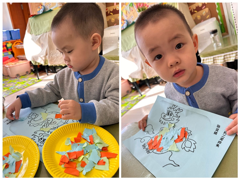 彩色折纸比较薄、易撕碎、颜色鲜艳,是孩子们喜欢的撕纸材料。将一张方形折纸撕成小块,放在盘子中,再将纸片粘贴在美术作品里,不仅锻炼小手精细动作的同时,也是孩子们感受美、创造美的过程。