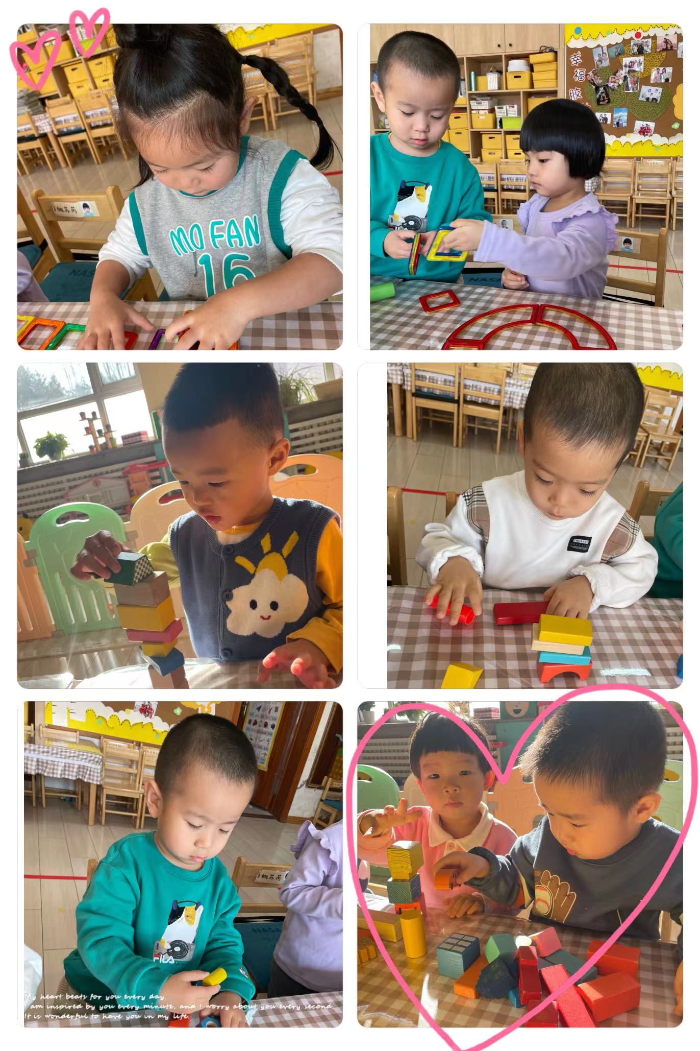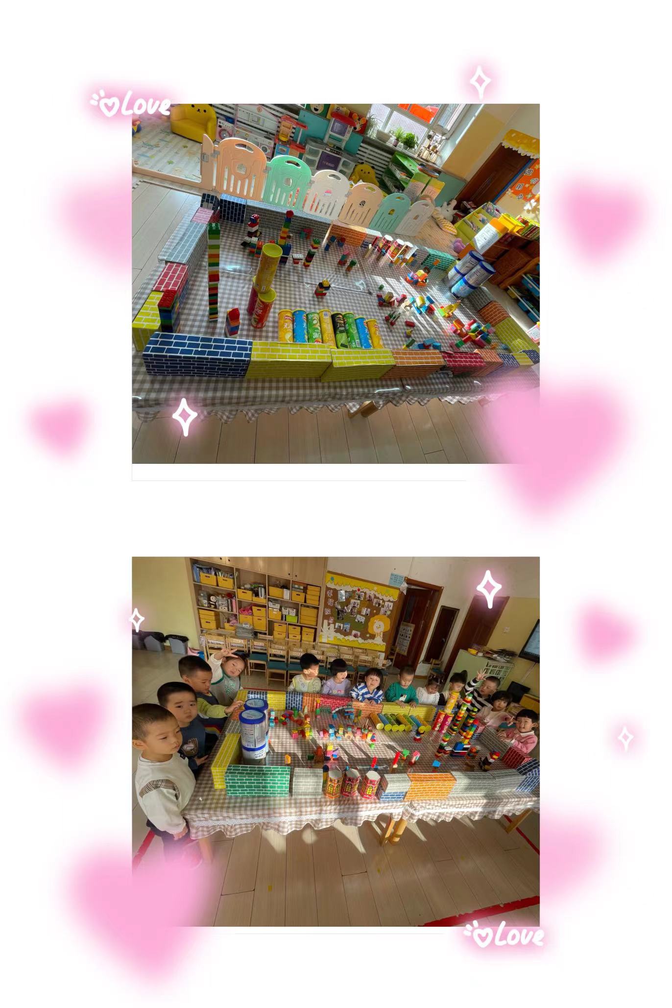 在几次建构中,孩子们不断的尝试,用不同的材料搭建成。垒高的过程会很难,有时候积木自己倒塌了,有时候不小心碰掉了,孩子们并没有放弃,认真的搭建着自己作品!自信的小脸洋溢着幸福的笑容!