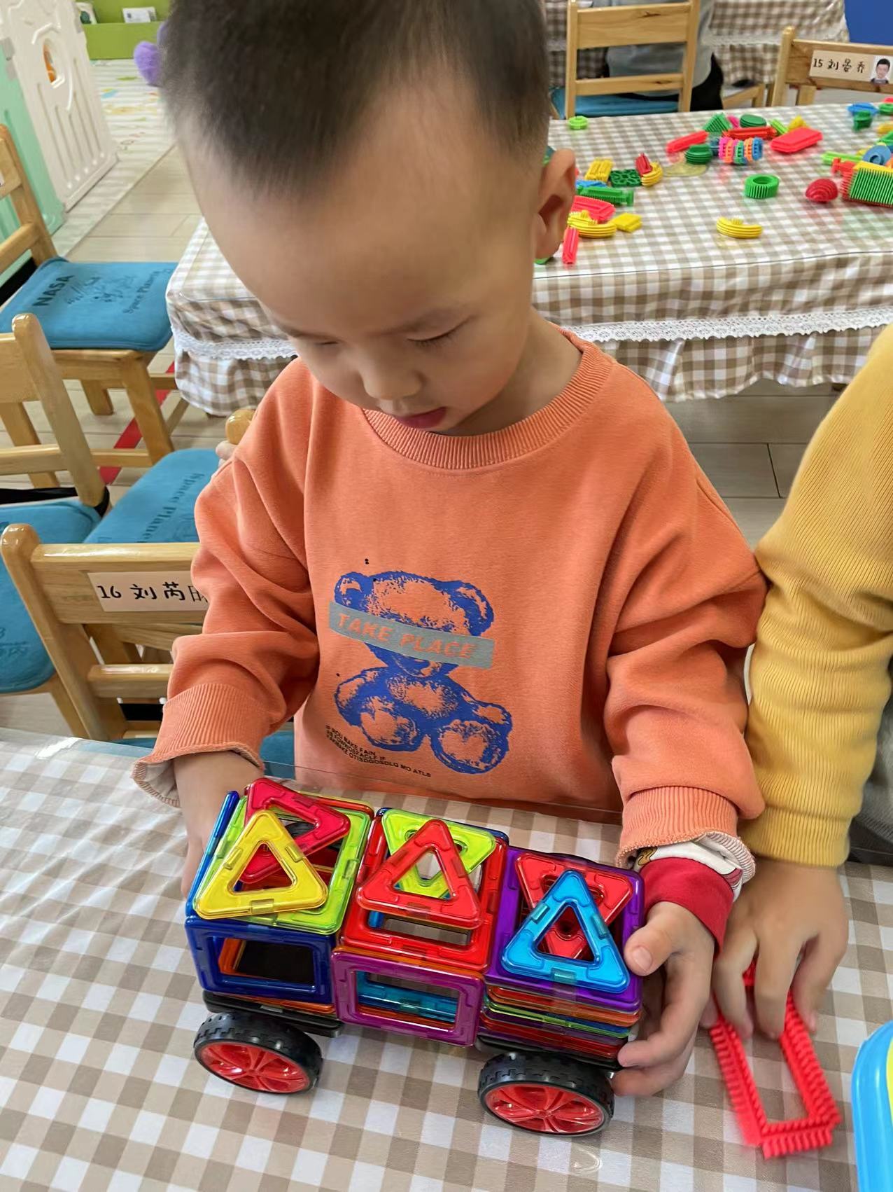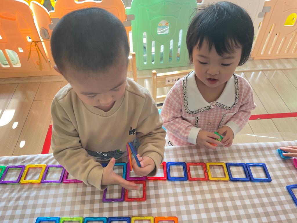 活动过程中,我们引导小朋友们也可以合作完成一个作品。瞧!这是展赫和晞晞一起用磁力片合作搭建的火车,是不是很棒呀!