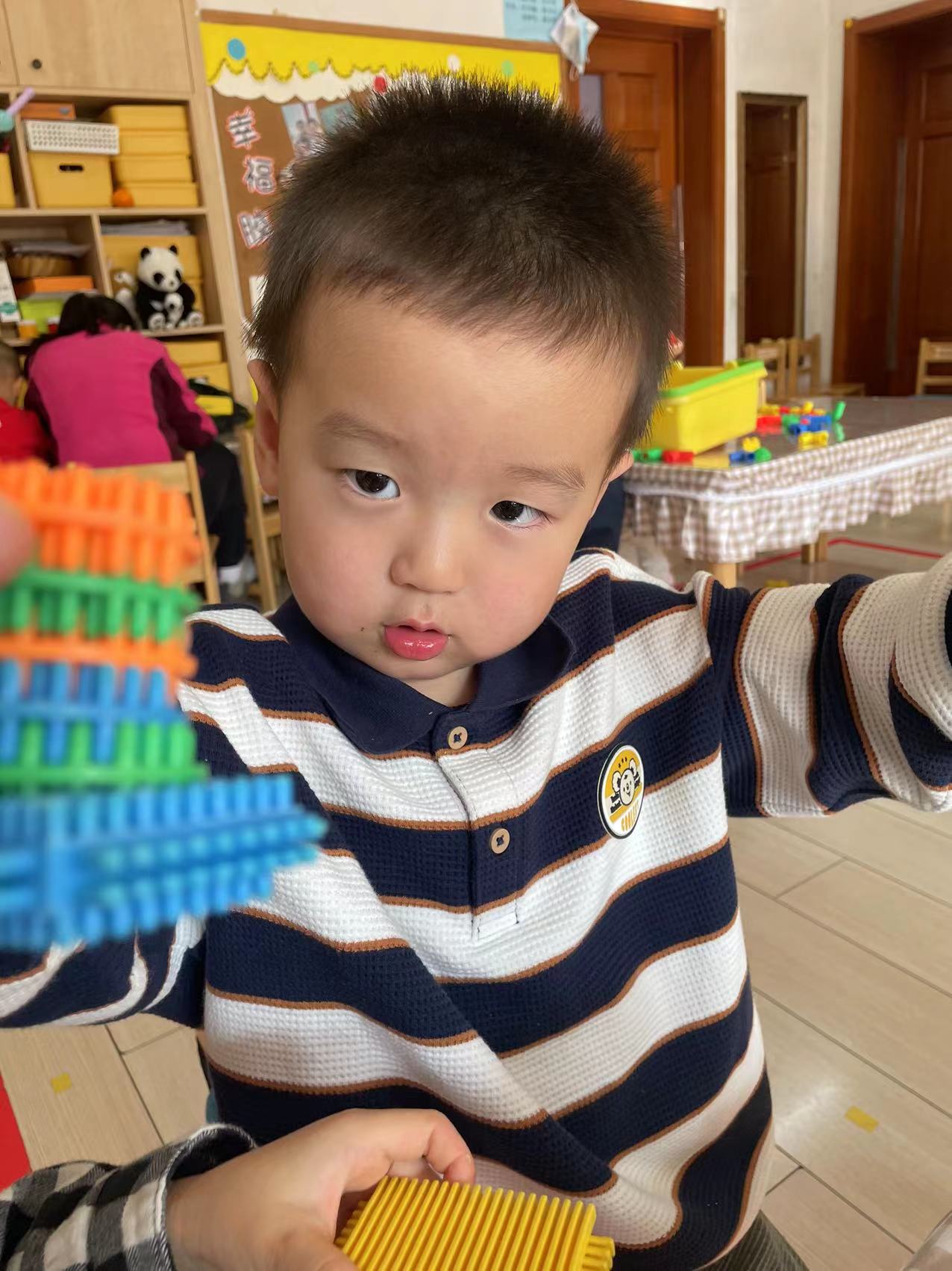 梯子对于小小班的孩子来说是很陌生的,他们不断尝试、探索,小宝说:“老师,我的梯子是不是很结实呀!”“你拼搭出梯子真好!”