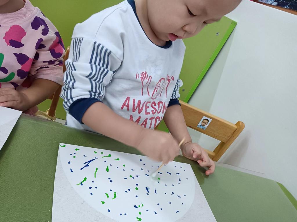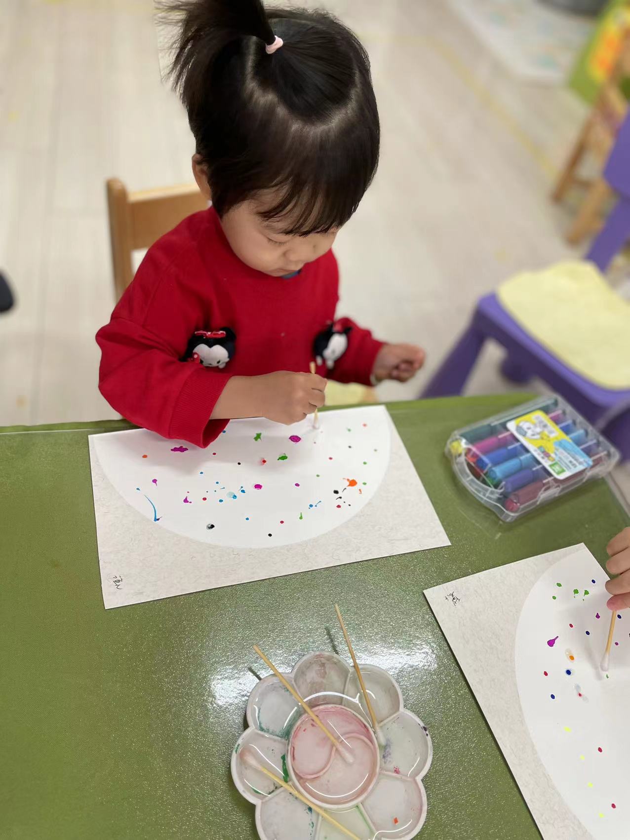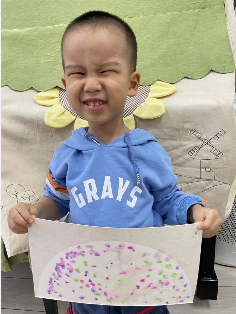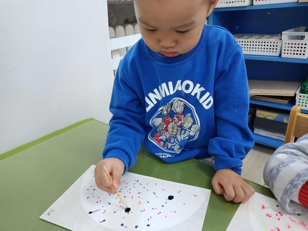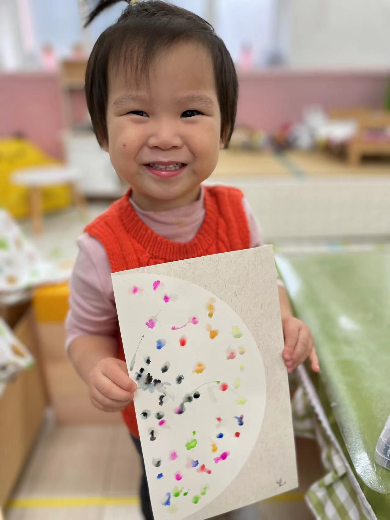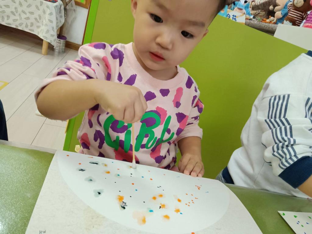 两岁半的孩子对各种各样的色彩充满着兴趣,通过点画、印画、涂鸦,感受颜料的触觉,和色彩做游戏,在创作的过程中,提升小手精细动作的敏感性。