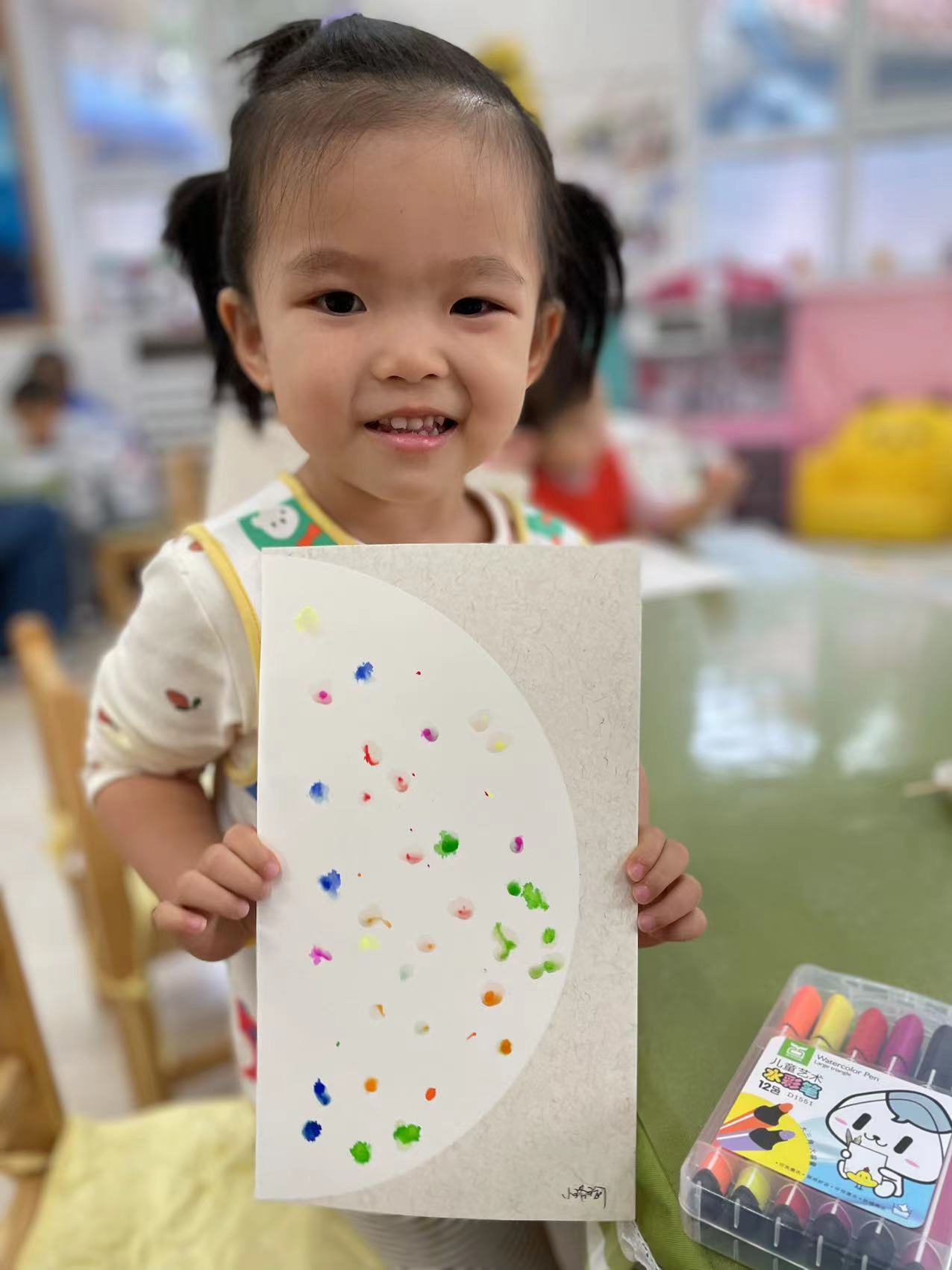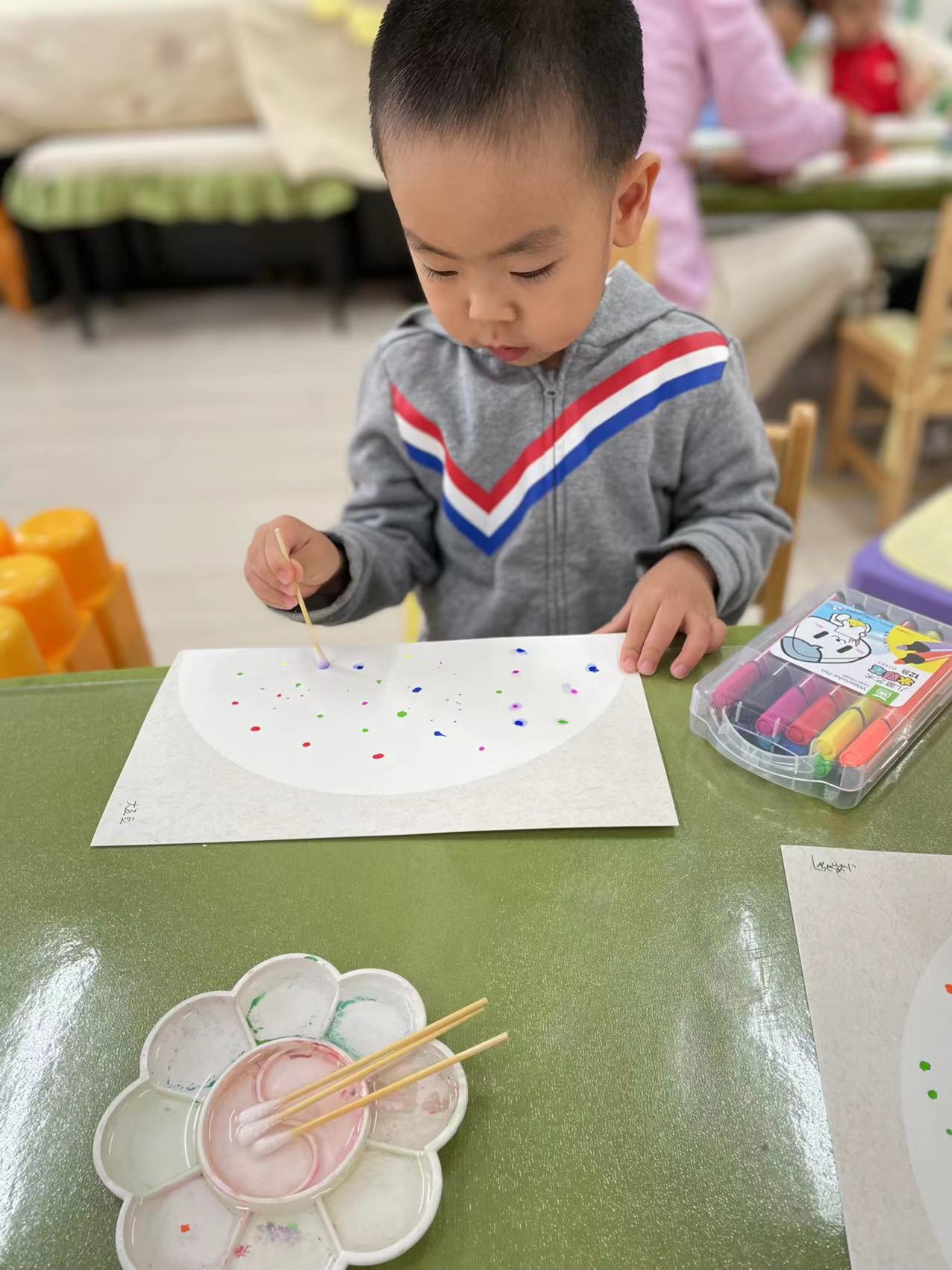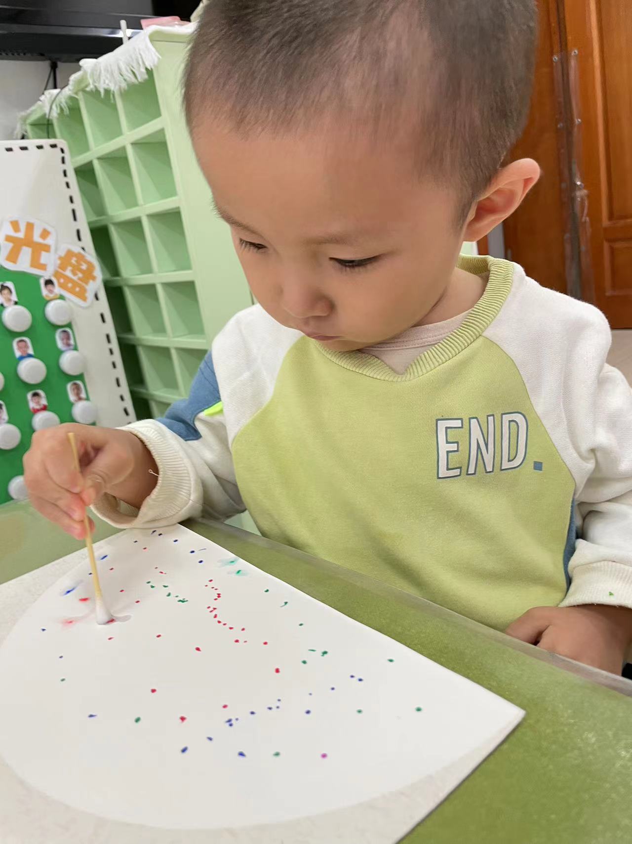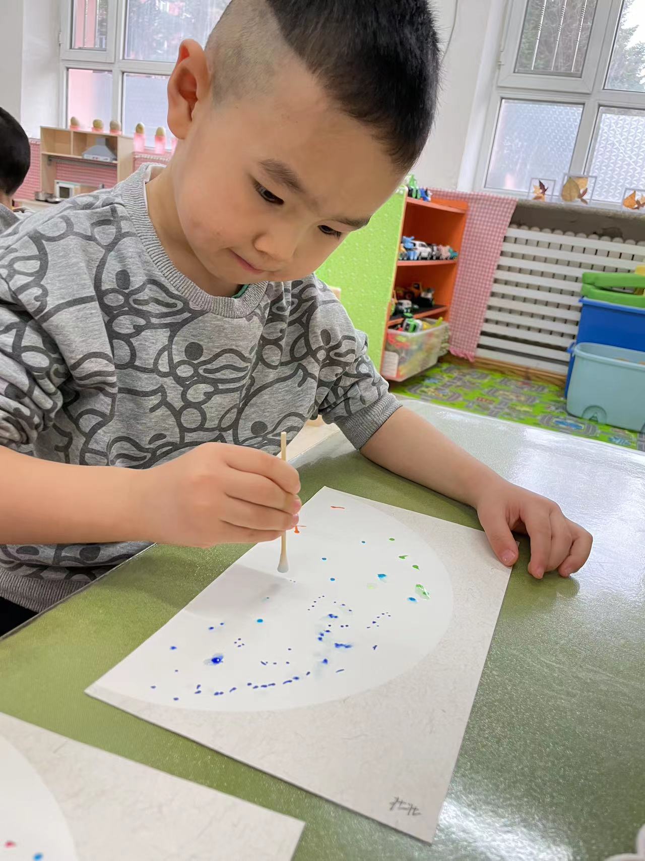 两岁半的孩子对各种各样的色彩充满着兴趣,通过点画、印画、涂鸦,感受颜料的触觉,和色彩做游戏,在创作的过程中,提升小手精细动作的敏感性。