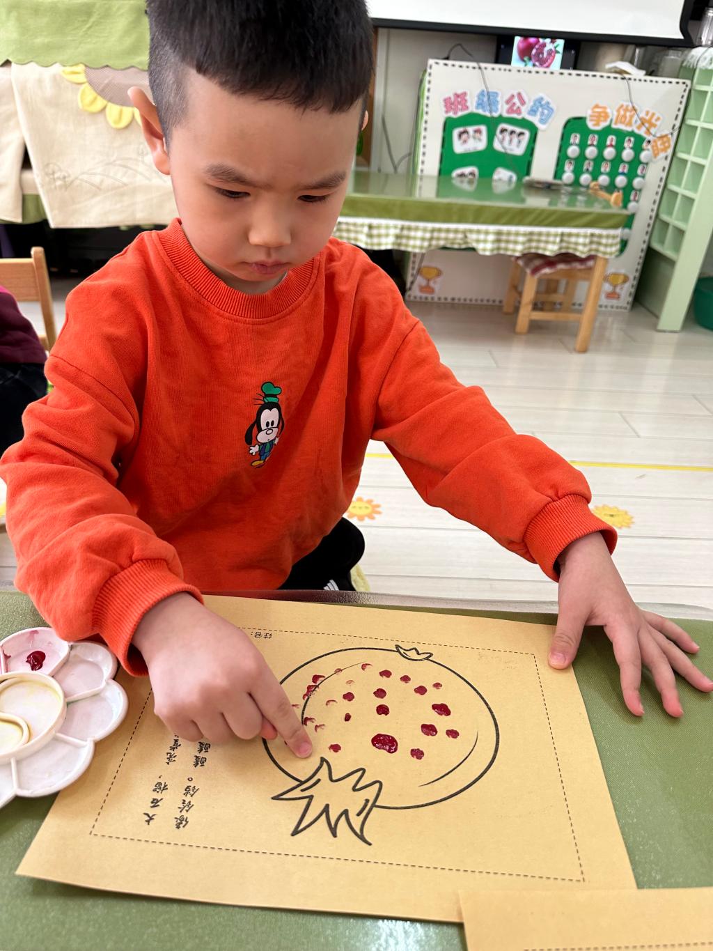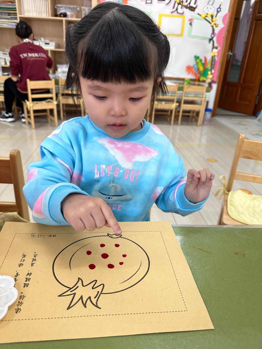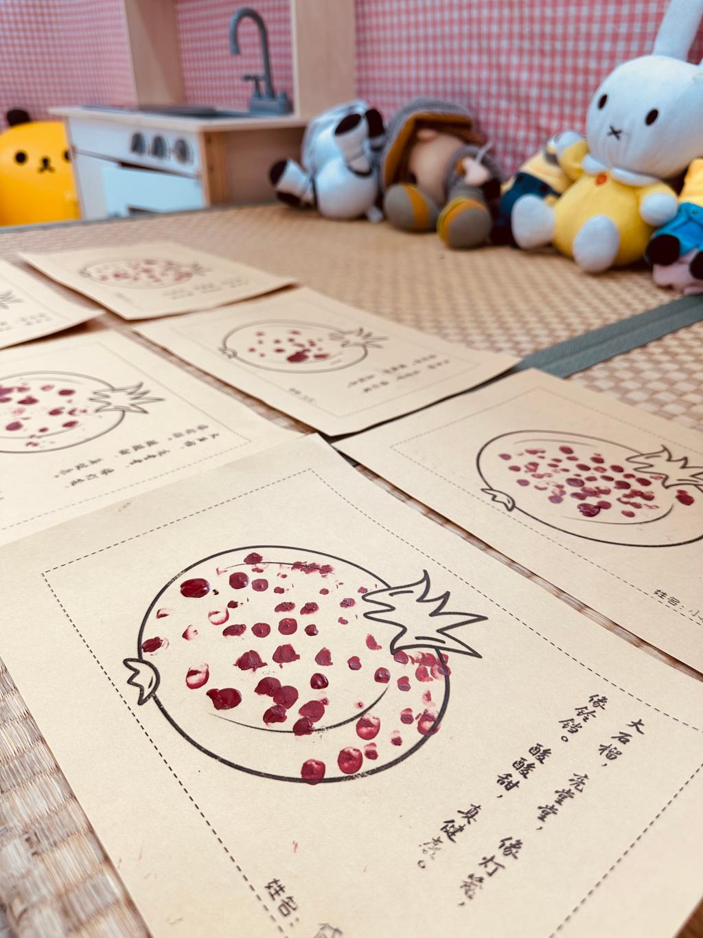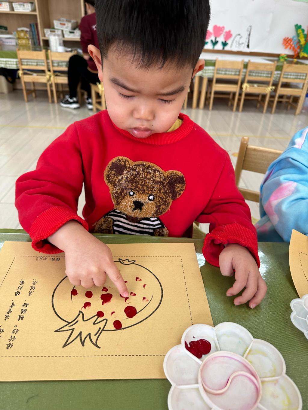 红红的石榴籽不仅美味,还是孩子们创意画的源泉,用手指蘸取红色的颜料,点在石榴画的中心,通过蘸、点、提的方法,大小不一的石榴籽就活灵活现的印在作品中了!孩子们感受到蘸取的颜料多少和用力大小,印出的石榴籽都长得不一样呢。