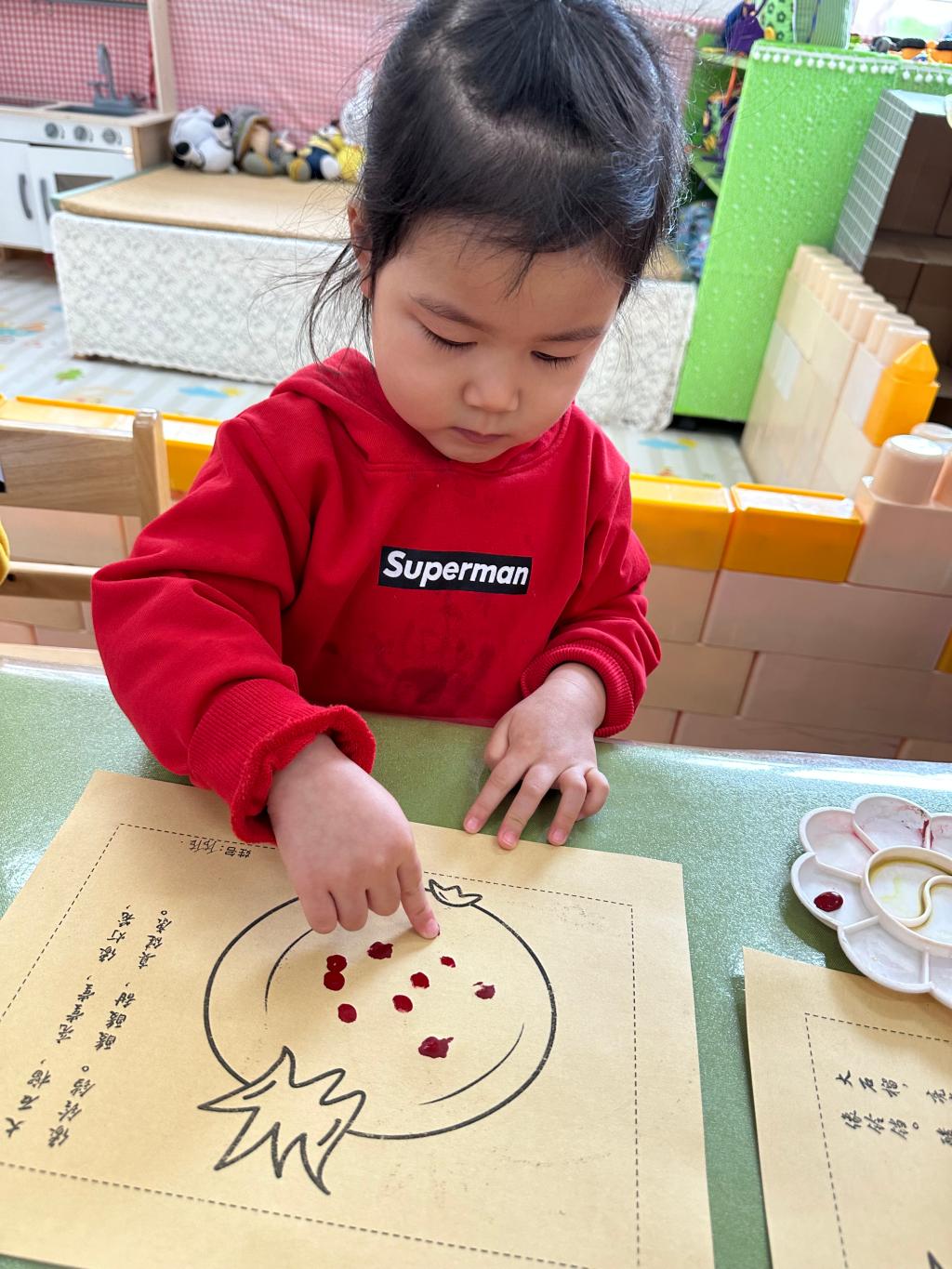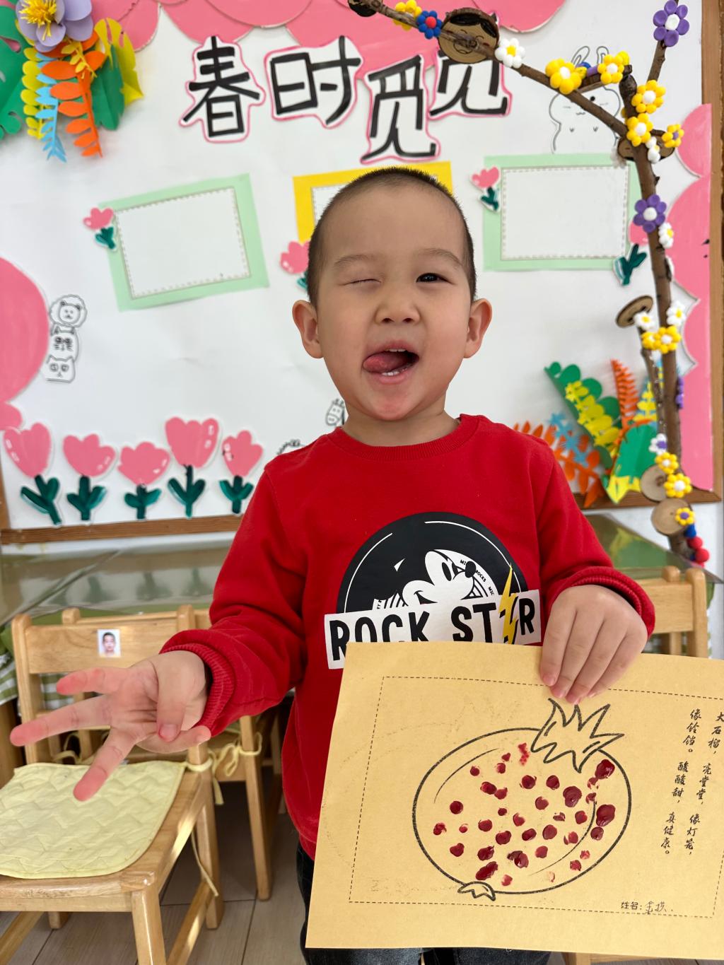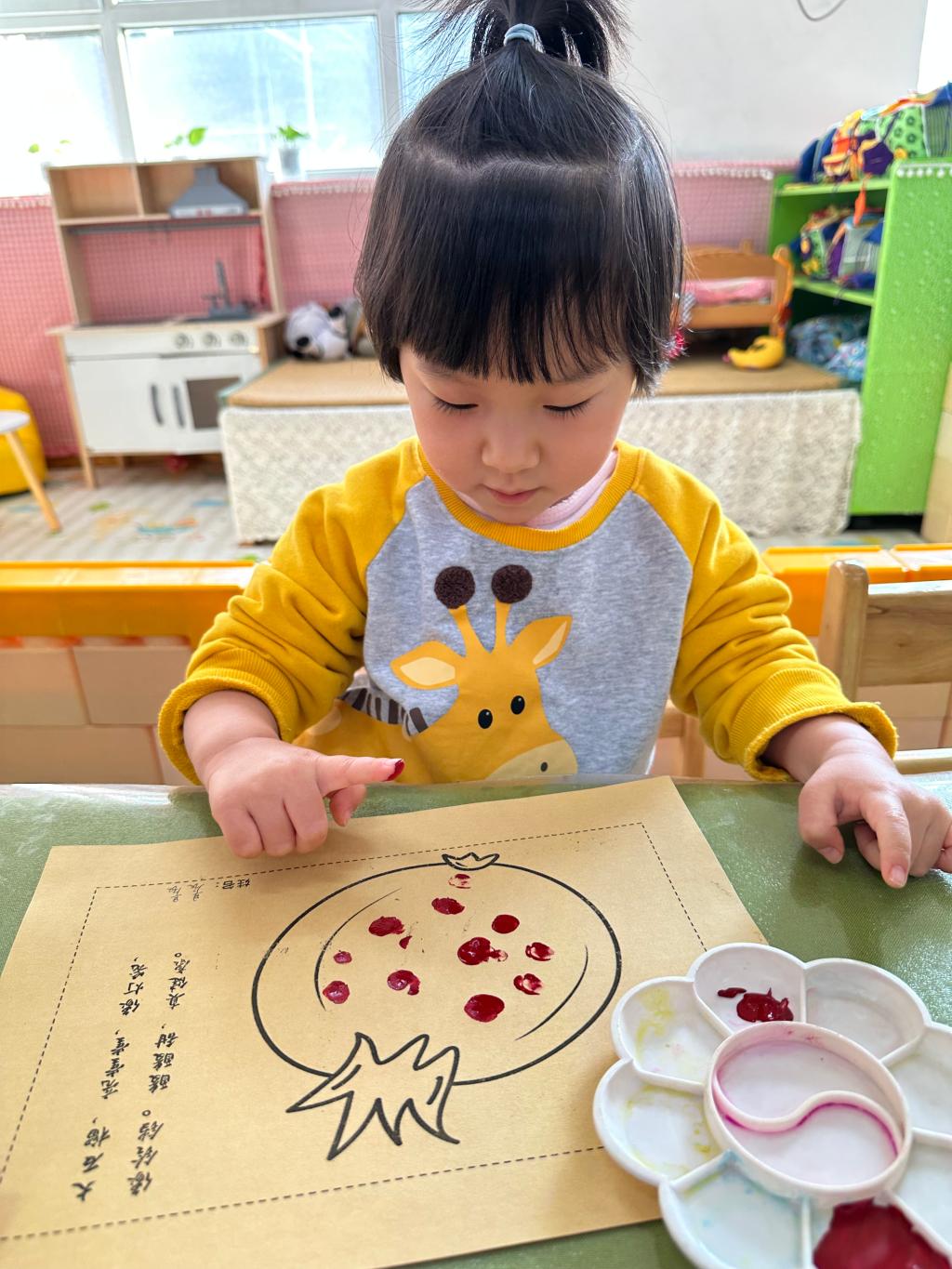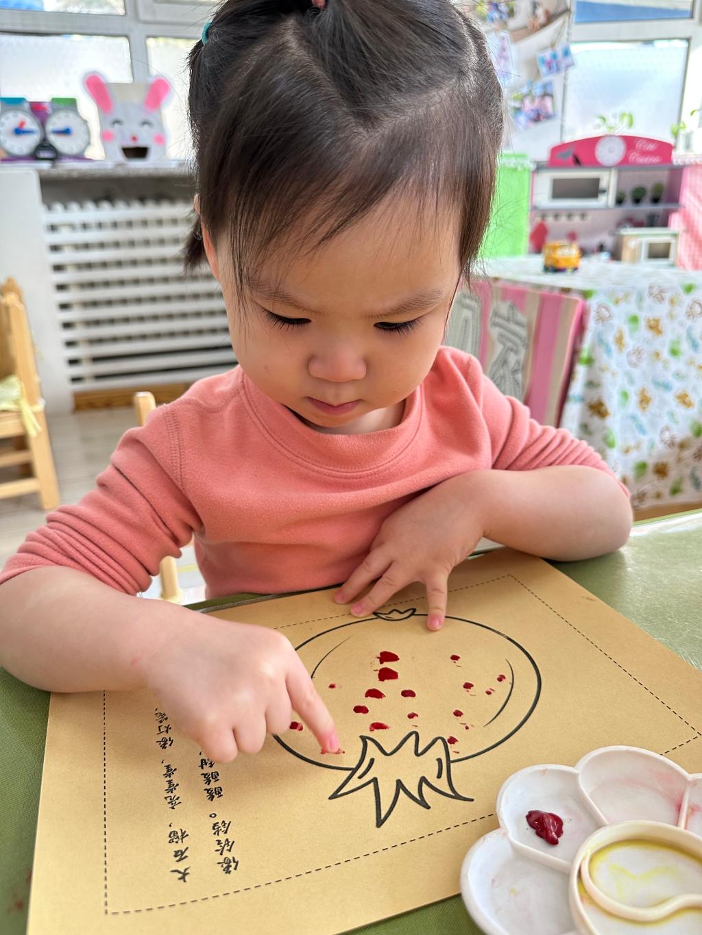 红红的石榴籽不仅美味,还是孩子们创意画的源泉,用手指蘸取红色的颜料,点在石榴画的中心,通过蘸、点、提的方法,大小不一的石榴籽就活灵活现的印在作品中了!孩子们感受到蘸取的颜料多少和用力大小,印出的石榴籽都长得不一样呢。
