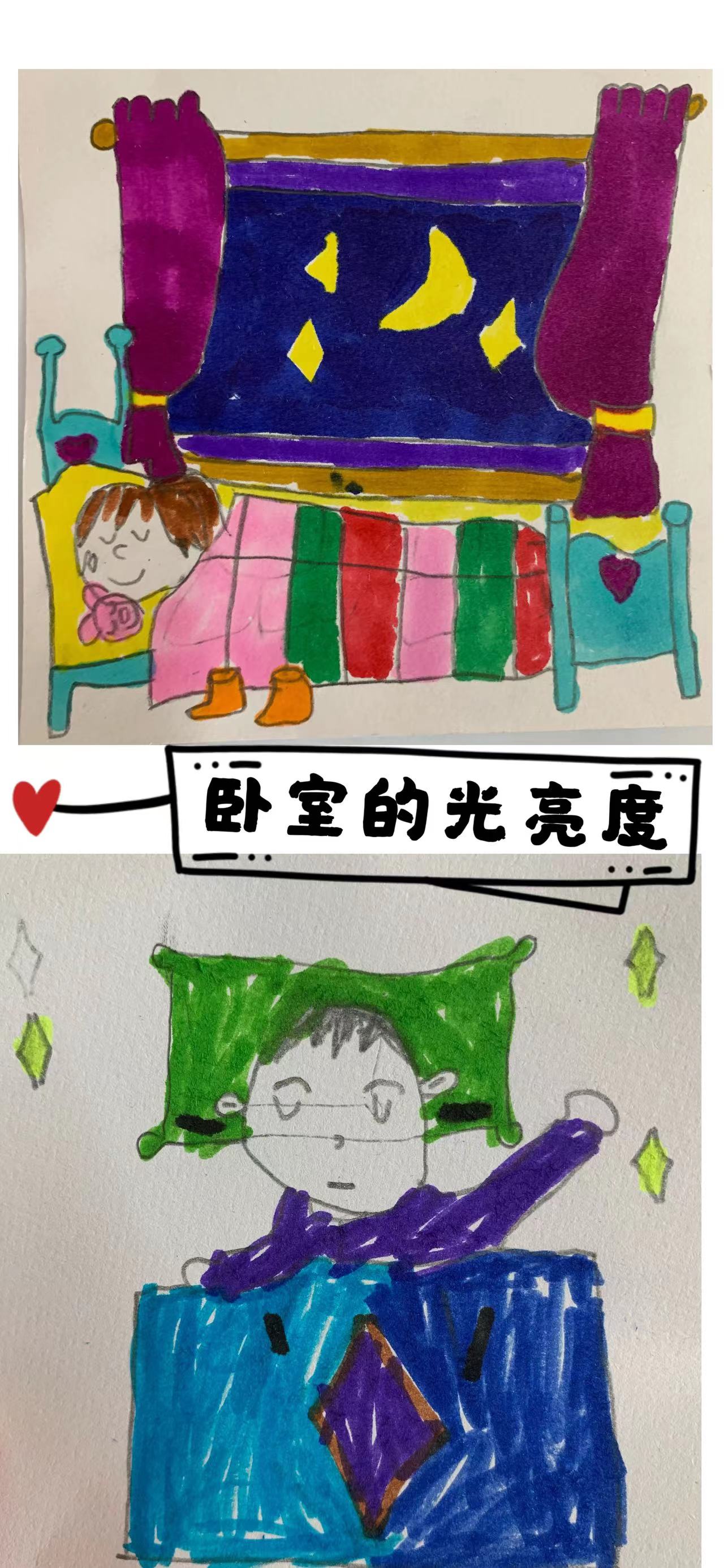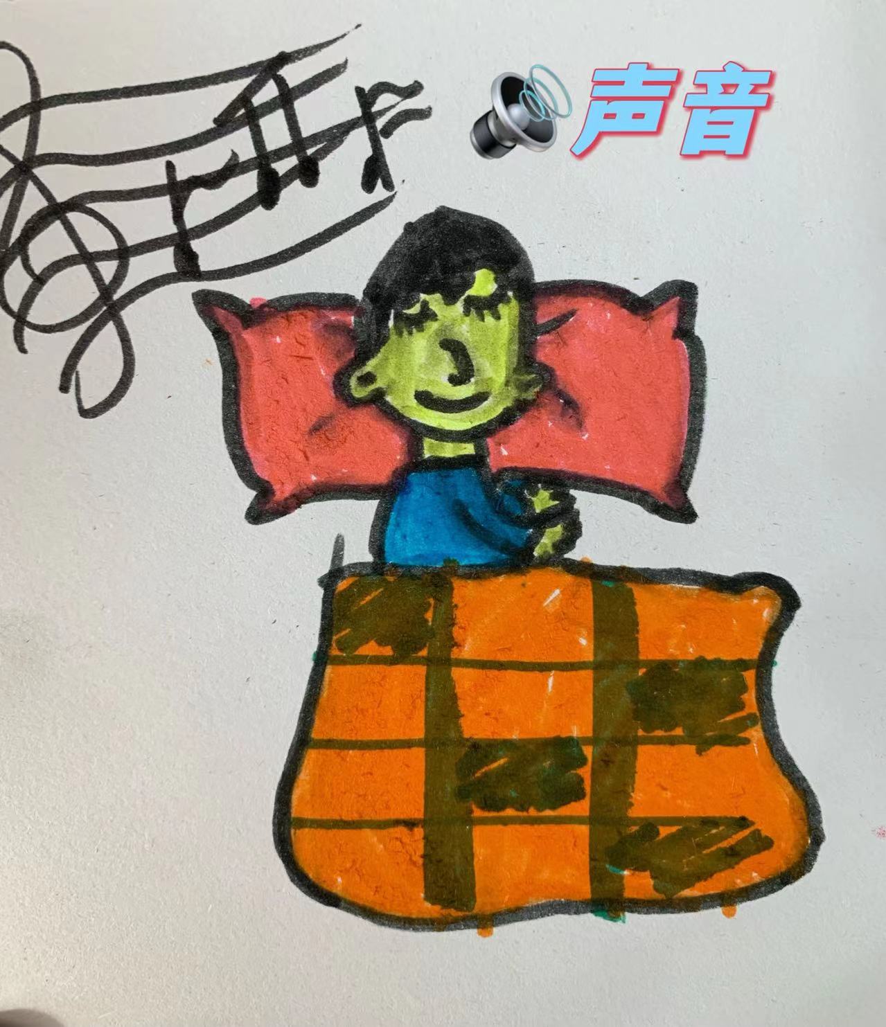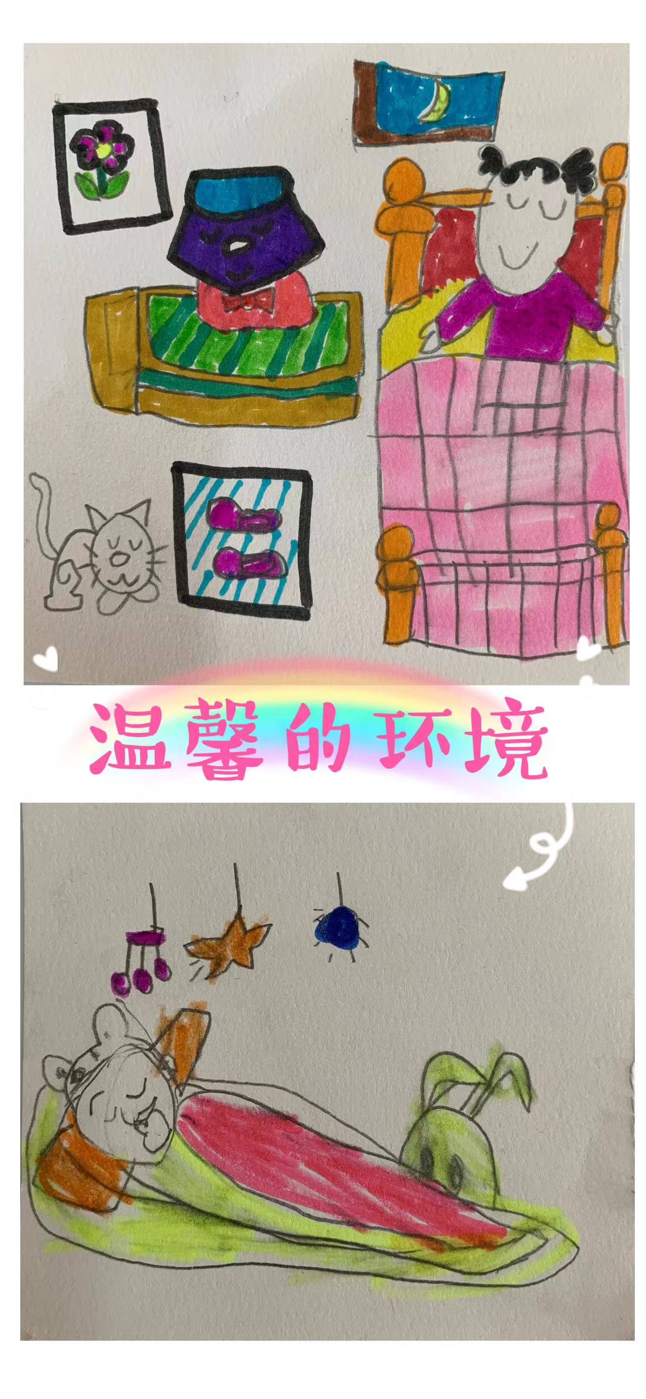 果果一班的宝贝们通过自己的书画,来告诉小朋友对睡眠影响的因素有声音、温度、光亮度、卧室布置还有合理饮食等。