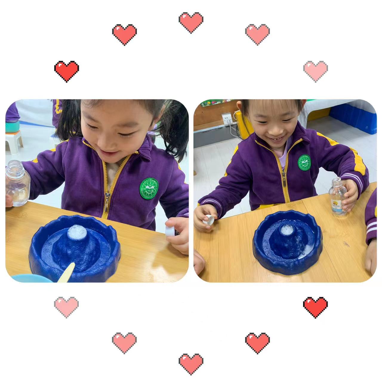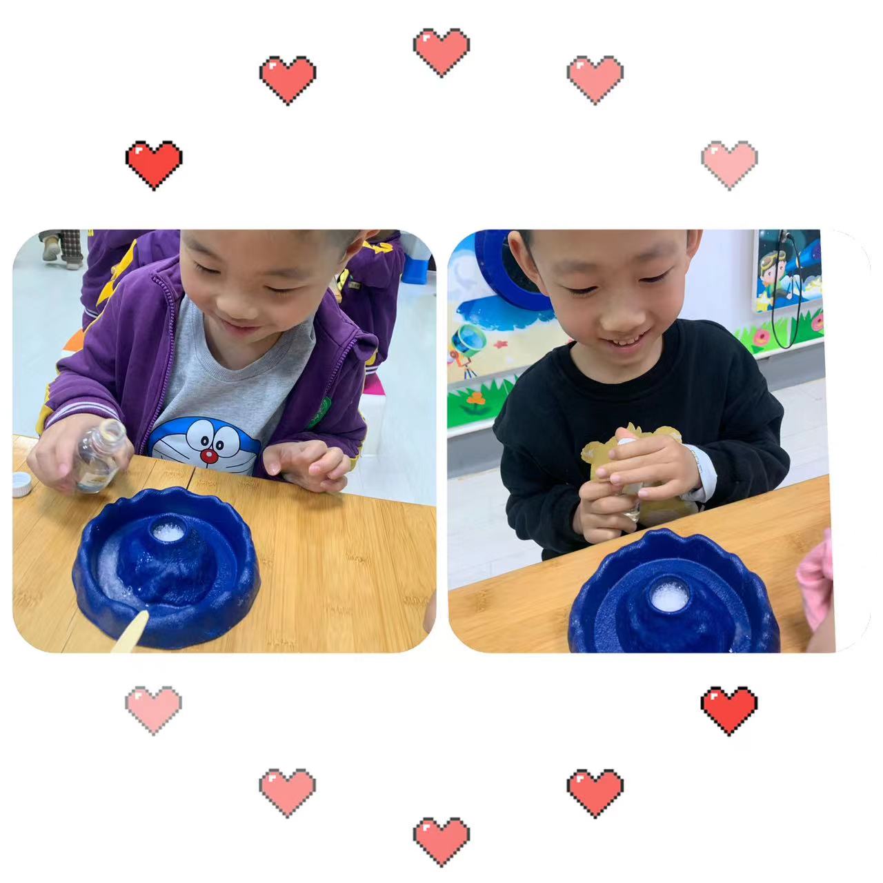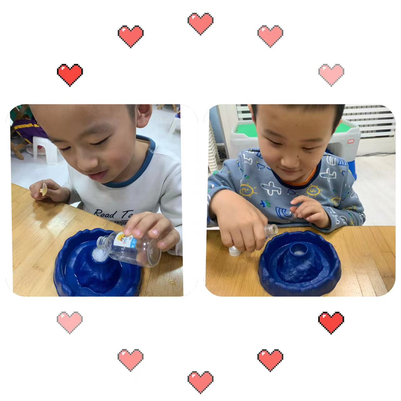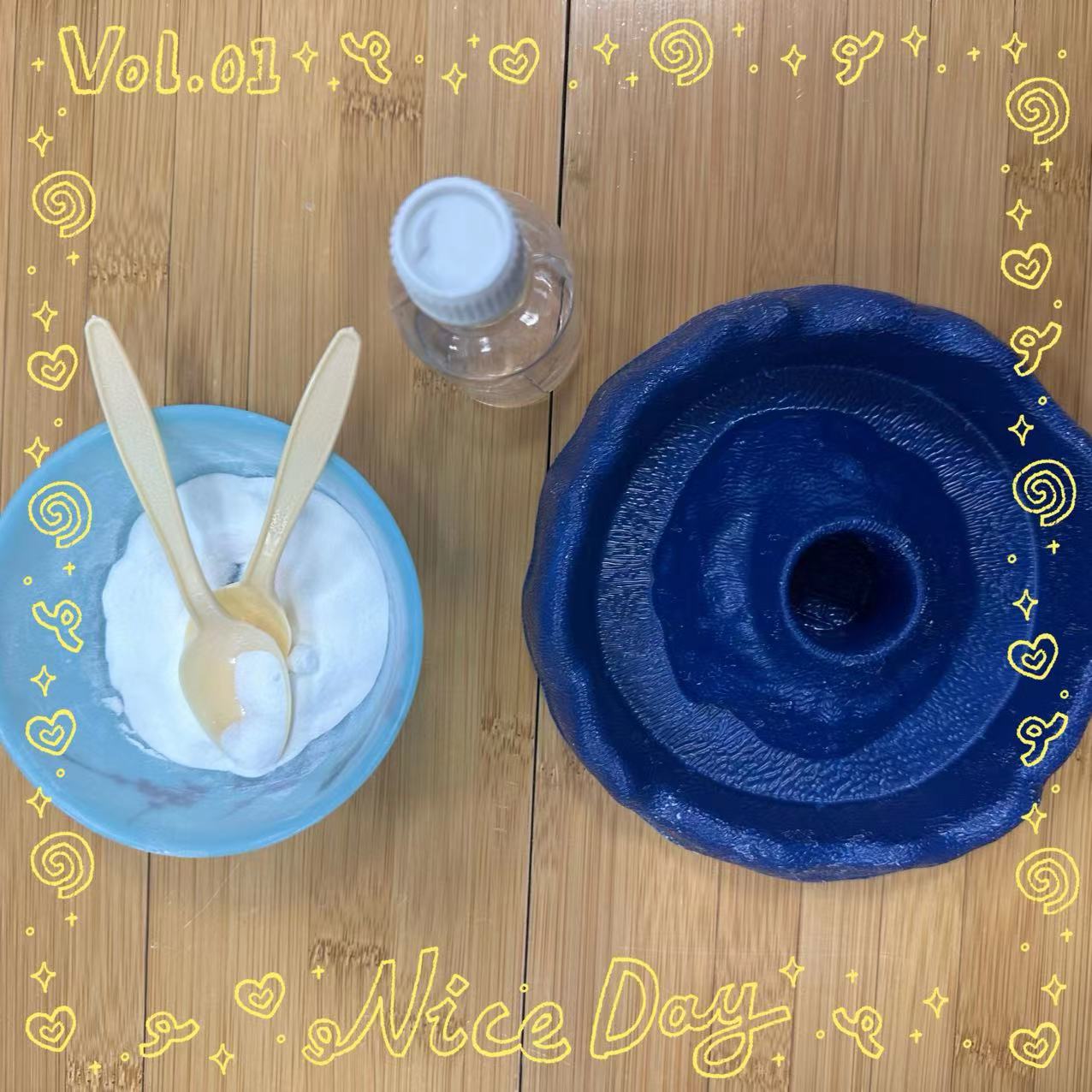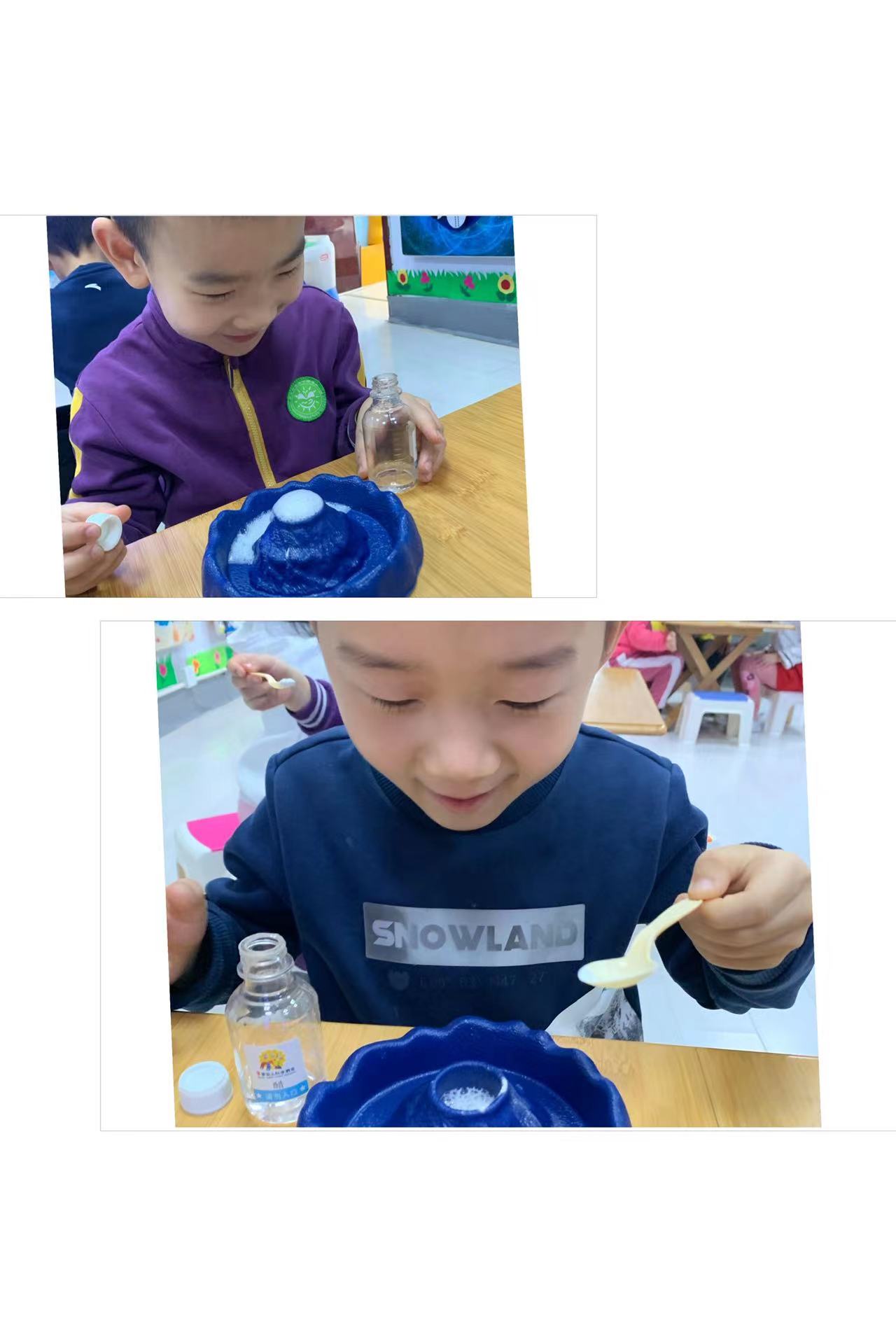 实验材料:苏打、白醋、勺子、火山小容器