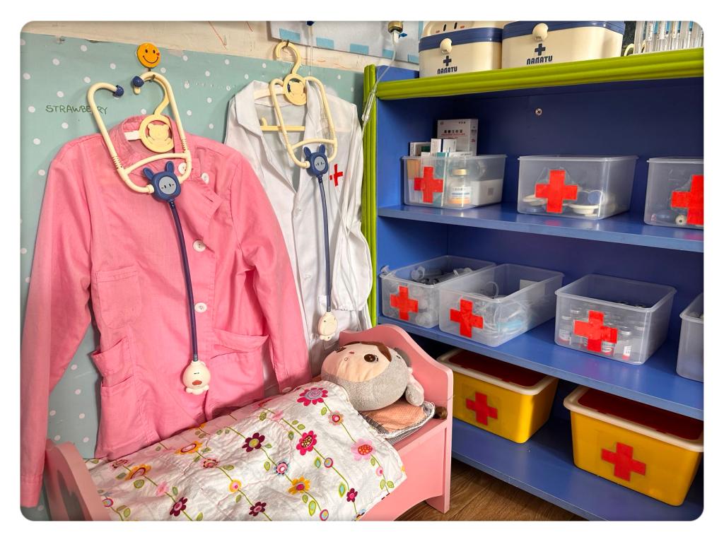 模仿是孩子的天性,区域的创设离不开孩子对生活的观察和模仿。在一次区域游戏中,娃娃家的“妈妈”照顾生病的宝宝:“孩子发烧了,需要去医院。”老师随后利用晨谈环节和孩子交流、讨论,孩子和家长共同搜集游戏材料,科室齐全的“小医院”游戏区很快就建立起来了。