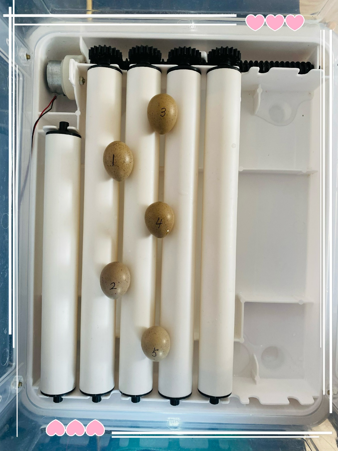 老师:“孵化器是一个透明的箱子,连上电是半自动孵化的,能够自动控温,自动旋转蛋。孵化前两天不能翻动,所以先放在下面一层。到了第三天就可以放在上面的转轮上,孵化器会定时旋转蛋,这样蛋宝宝受热才会均匀,10多天后小鸡就可以出壳了。” 首先,我们先给芦丁鸡蛋做标记。