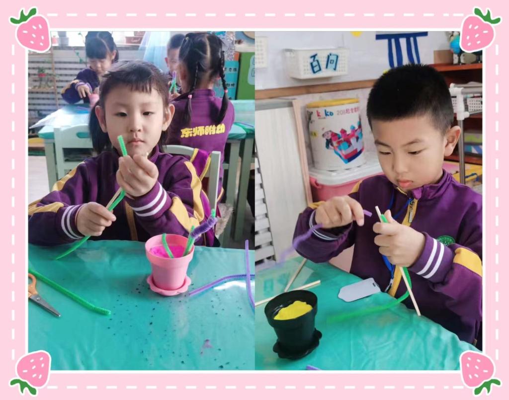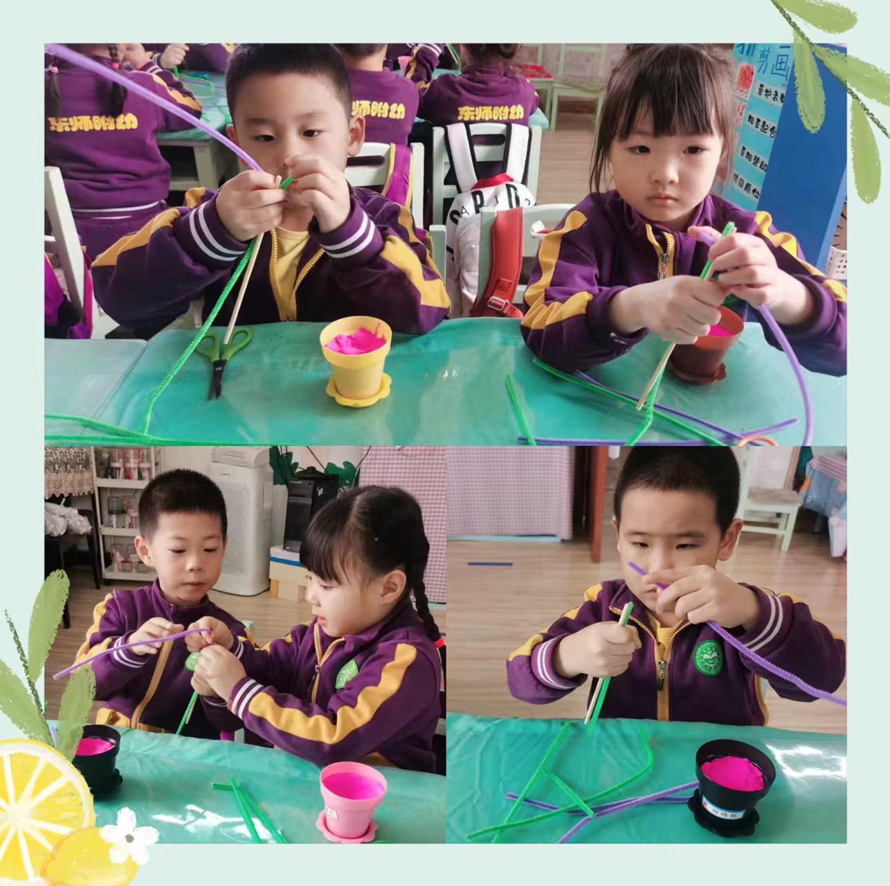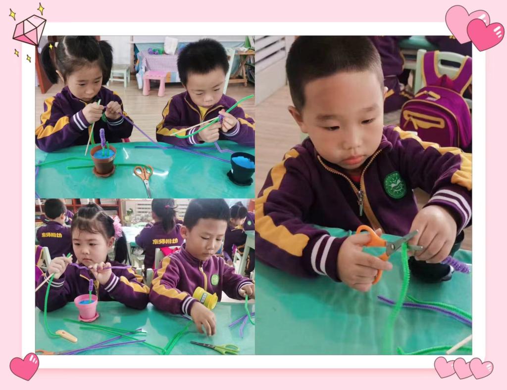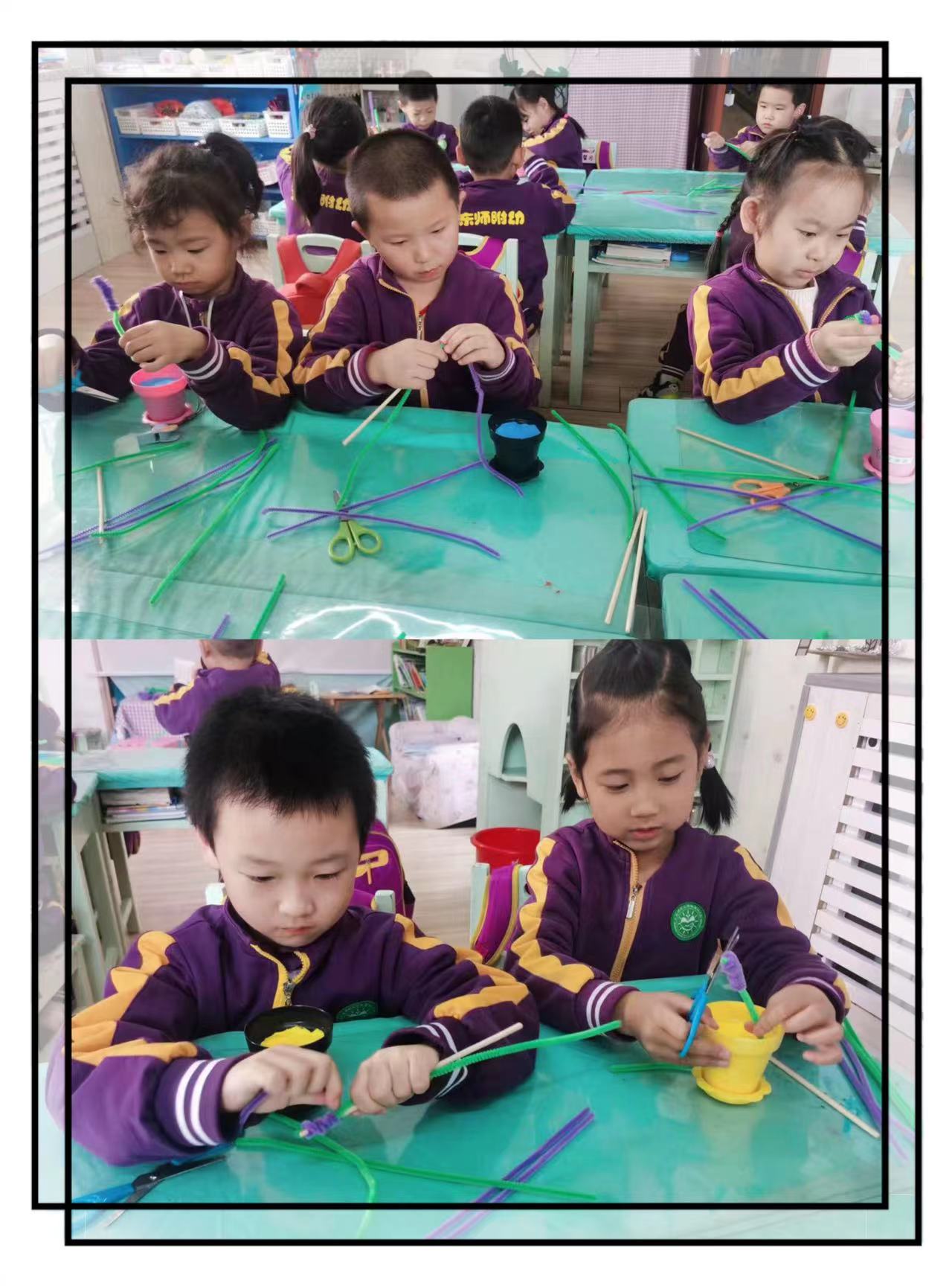 小朋友们按照自己心中对春天的理解和向往,用灵活的小手缠绕着、穿插着、调整着。