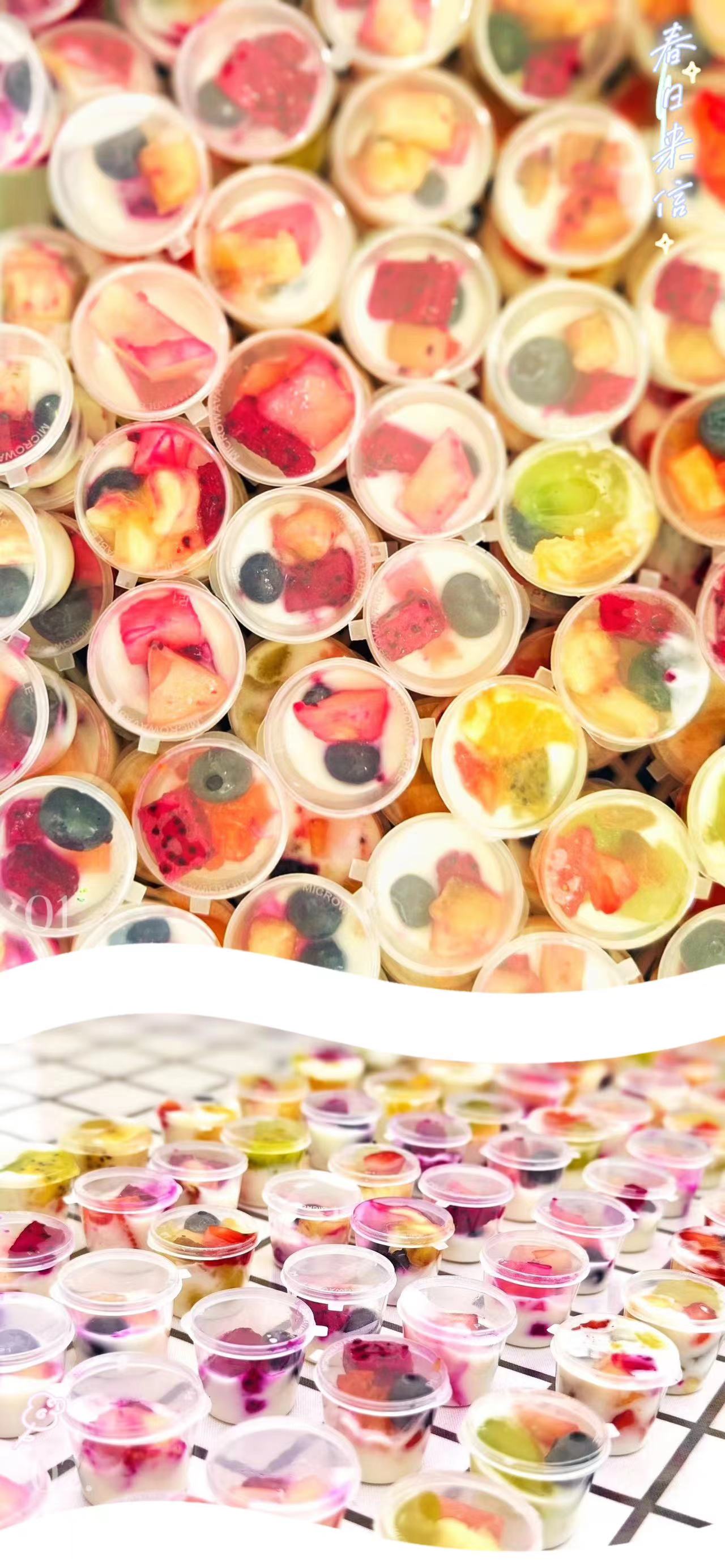 为了做好前期准备,我们将买好的水果切成小块,把籽去掉,分装在小盒里并挤上酸奶,最后盖上盖子并摆好。