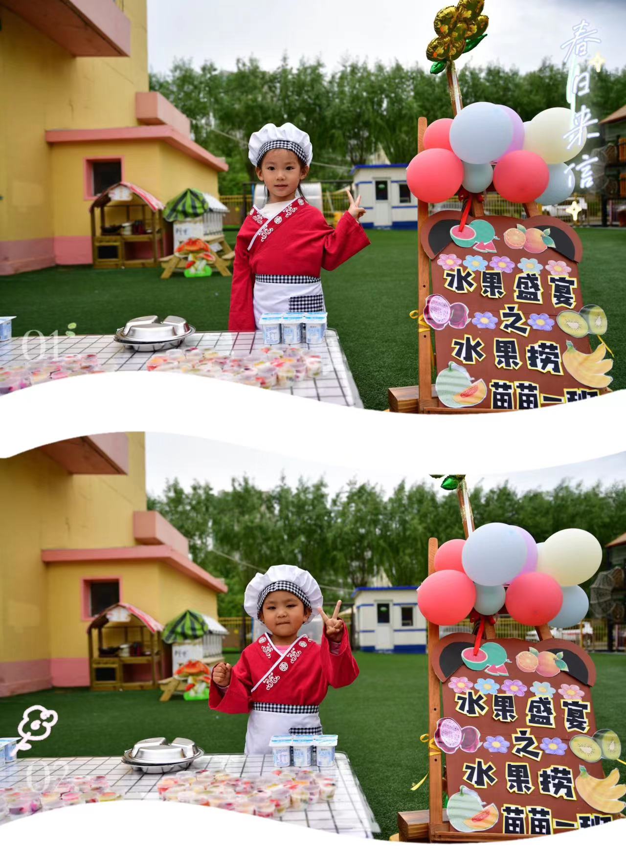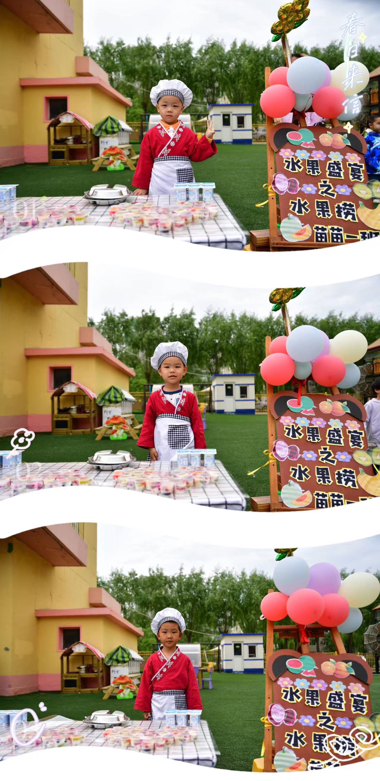 我们的美食节活动要开始啦!每位小朋友都迫不及待要去品尝美食呢!小朋友们采取轮换制分成3小队,第一小队先穿上小厨师的衣服,做为小小售货员负责销售班级的水果捞。第二、第三小队先去品尝,每位小朋友都能穿上小厨师的衣服做销售员也可以去品尝各种美食。