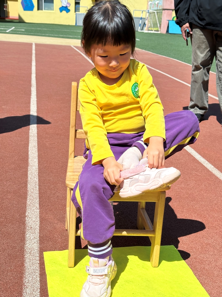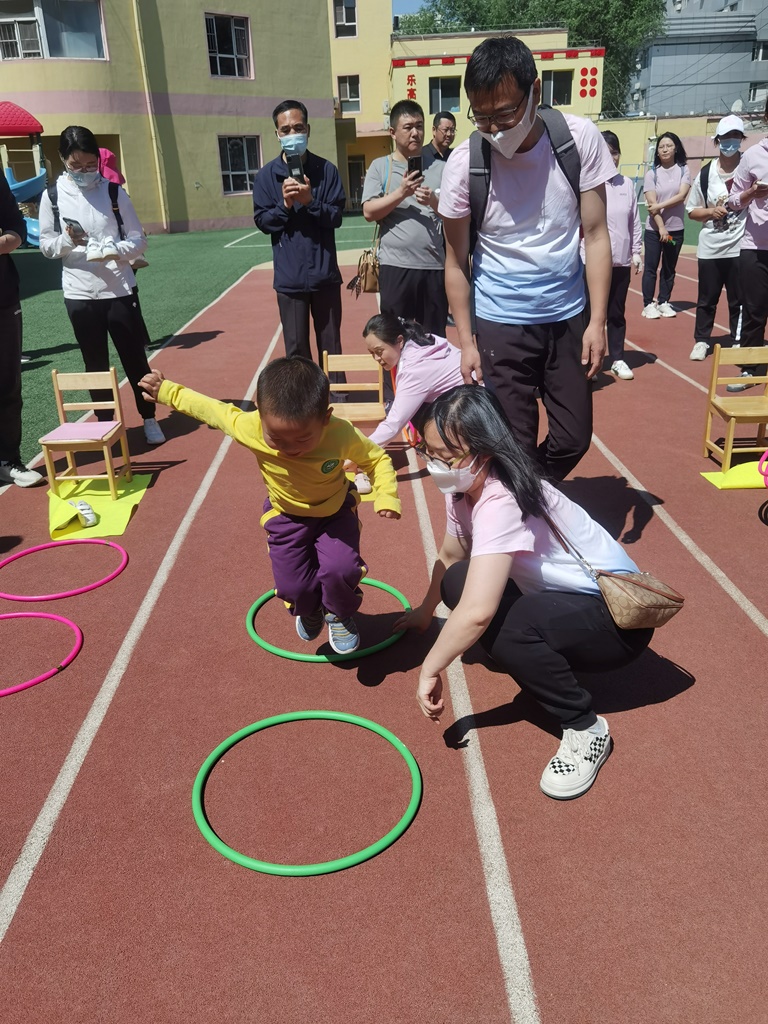 我是小能手的游戏,自己穿好小鞋子,与家长配合跳圈回到起点,充分体现出孩子们在幼儿园提升的自理能力。