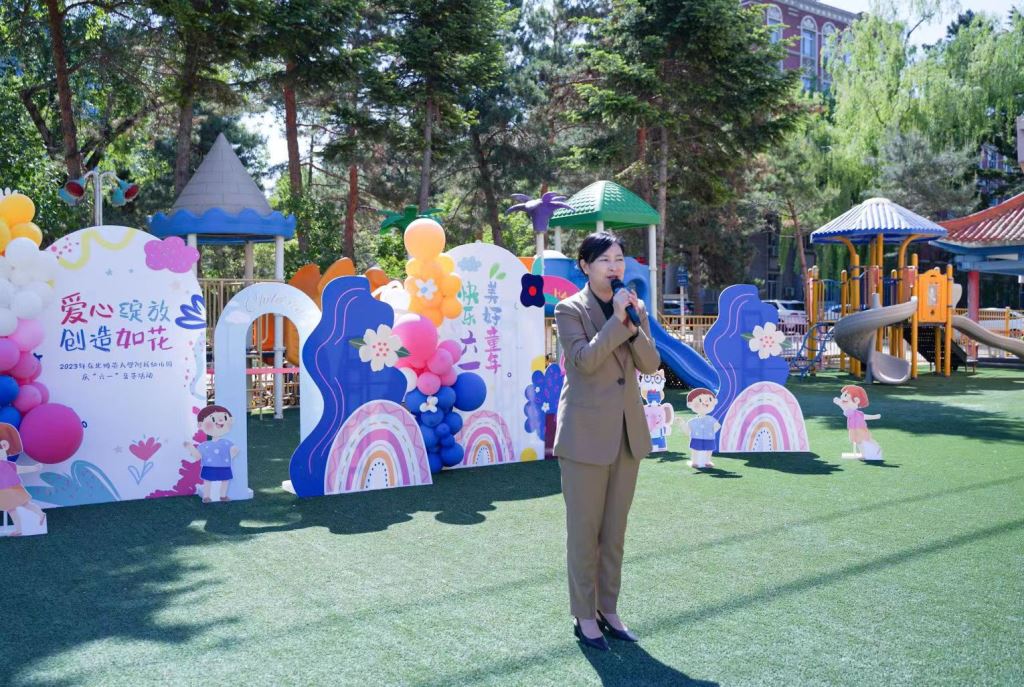 看到我们充满阳光、活力、自信的孩子们,幼儿园的缴园长、常书记和园领导们也来为小朋友们加油啦!罗园长代表园领导致辞,她对参加本次运动会的家长朋友们表示热烈欢迎,希望孩子们一起庆祝属于自己的节日,感受六一儿童节的快乐,在东师附幼的沃土中发展小绅士、小淑女的好品质,健康快乐的成长,也期待家长与孩子默契配合,享受亲子同乐的幸福。