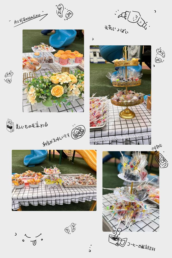 苗苗五班家长积极参与到小朋友们的活动中,最终确定几名家长志愿者和孩子们一起参与到本次活动中。家长志愿者在微信群里积极地讨论怎么制作食物和提供的食材。活动当天家长志愿者也早早来到班级做活动前准备。自制的棒棒水果、棒棒蛋糕、麦芽棒棒糖、溶豆、棒棒小熊蛋糕、琥珀核桃仁、膳食纤维棒棒软糖、棒棒鳕鱼肠、还有好喝的百香果柠檬蜂蜜水,仪式感满满。