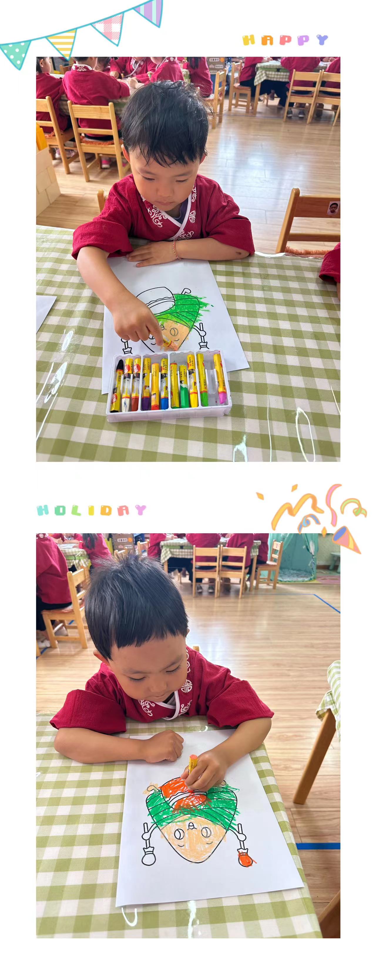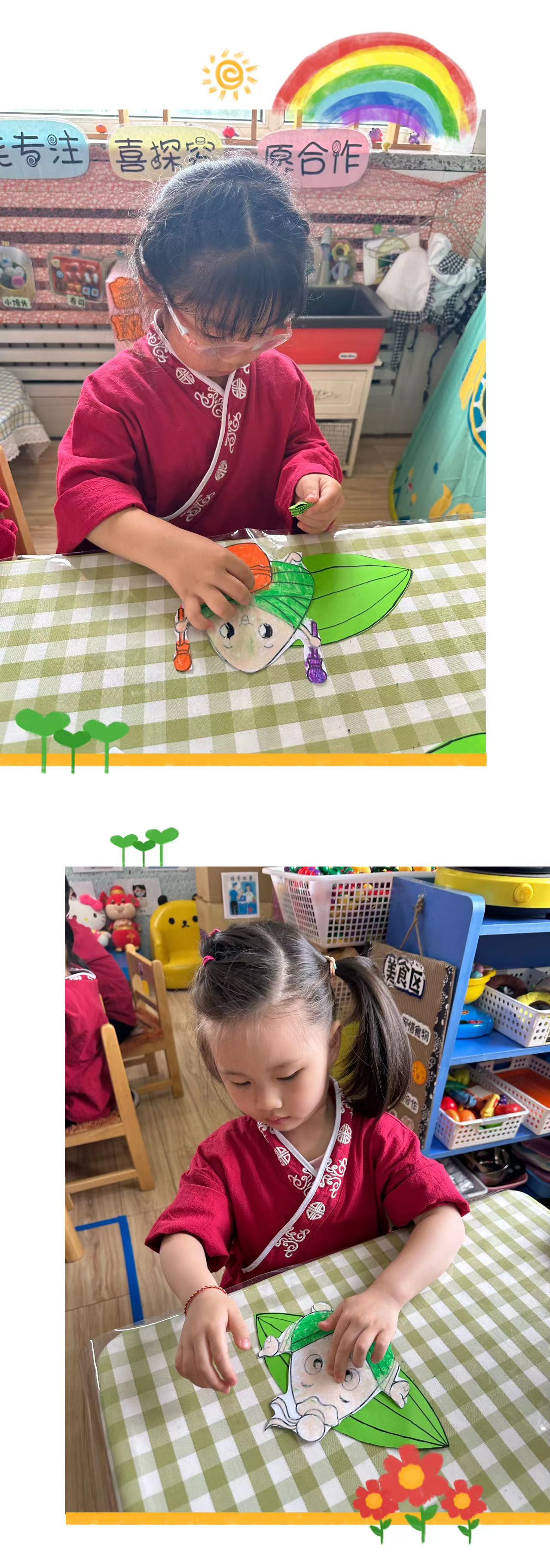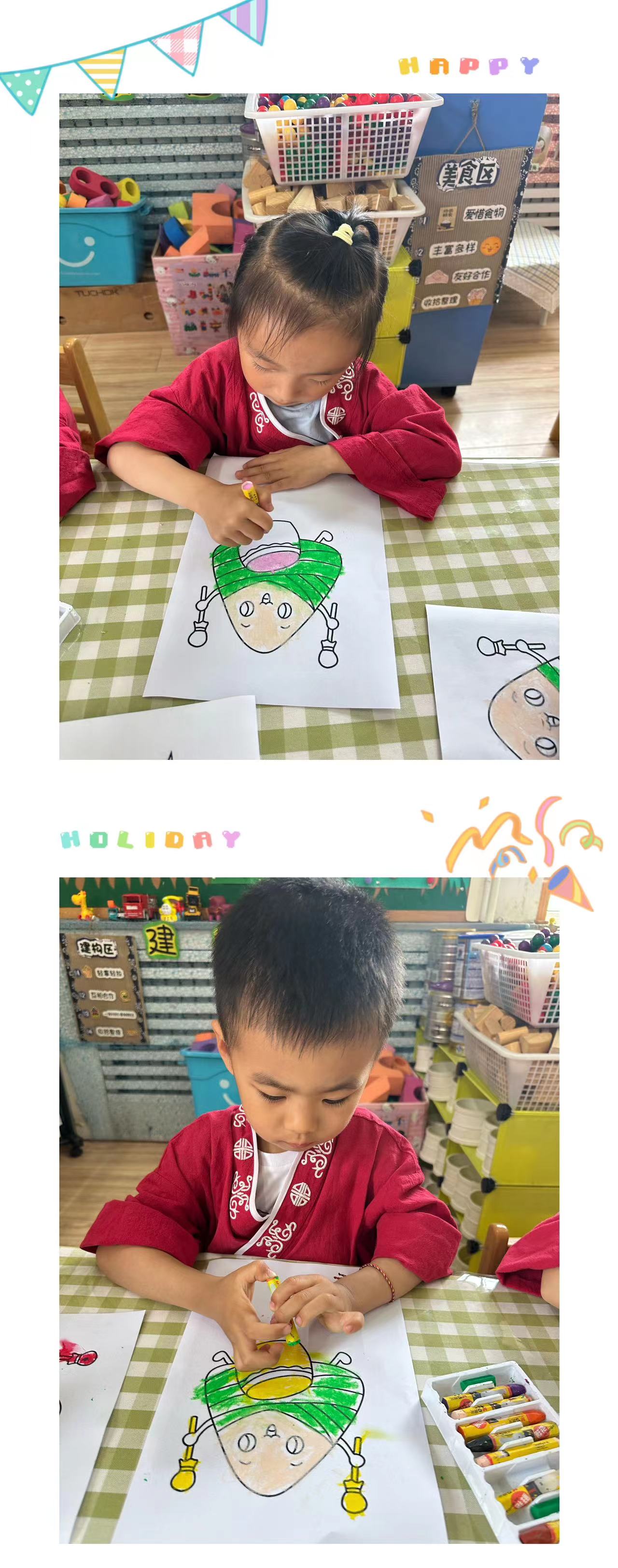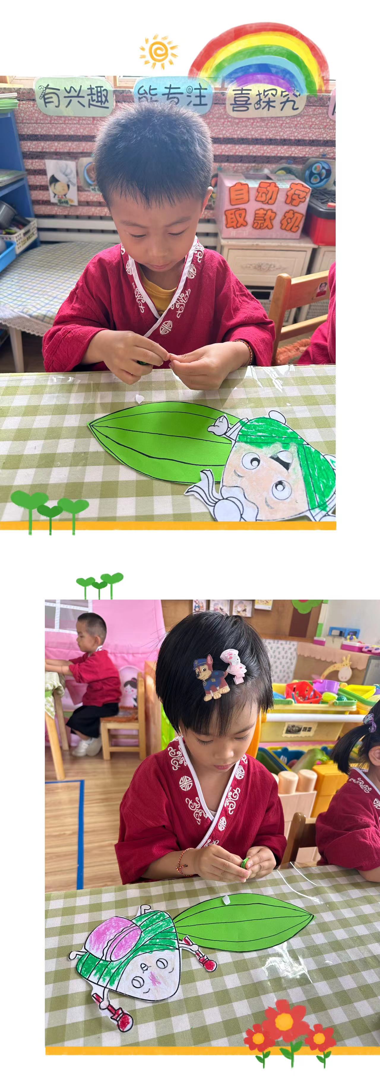 小朋友们了解端午节的由来,接下来和老师一起制做创意手工——“会跳舞的粽子”。