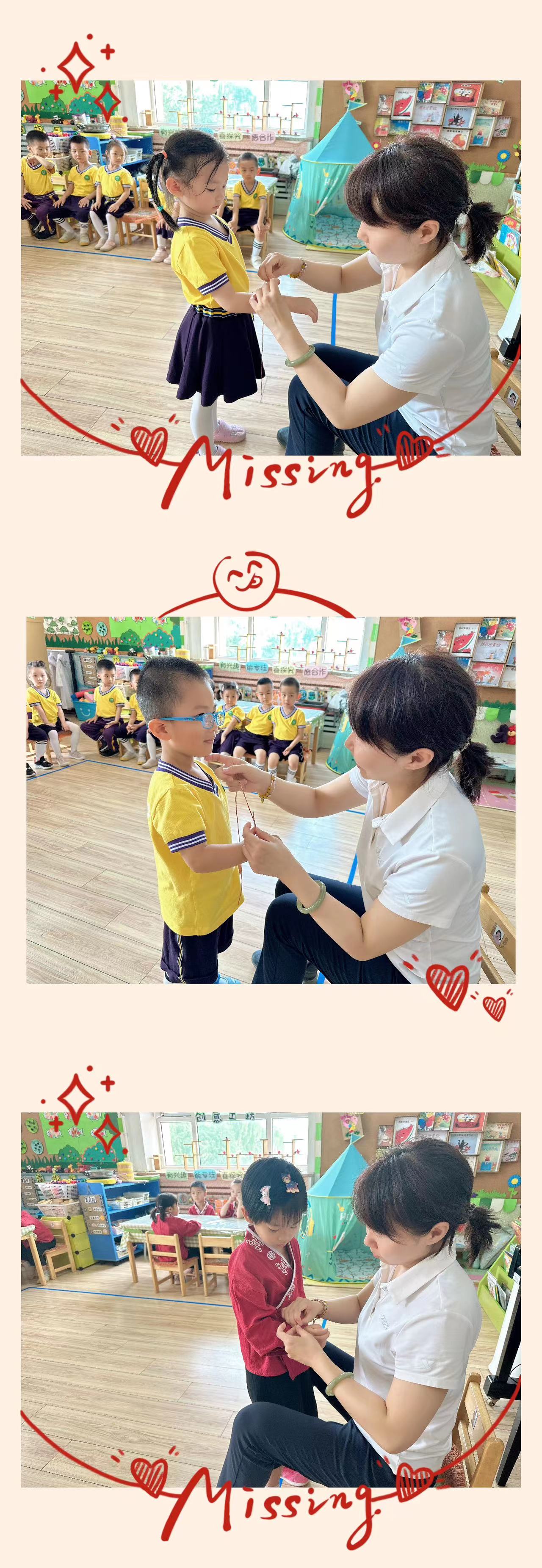 小朋友真棒呀!苗苗一班的老师为小朋友准备了好看的五彩绳,那现在老师就为你们带上吧!
