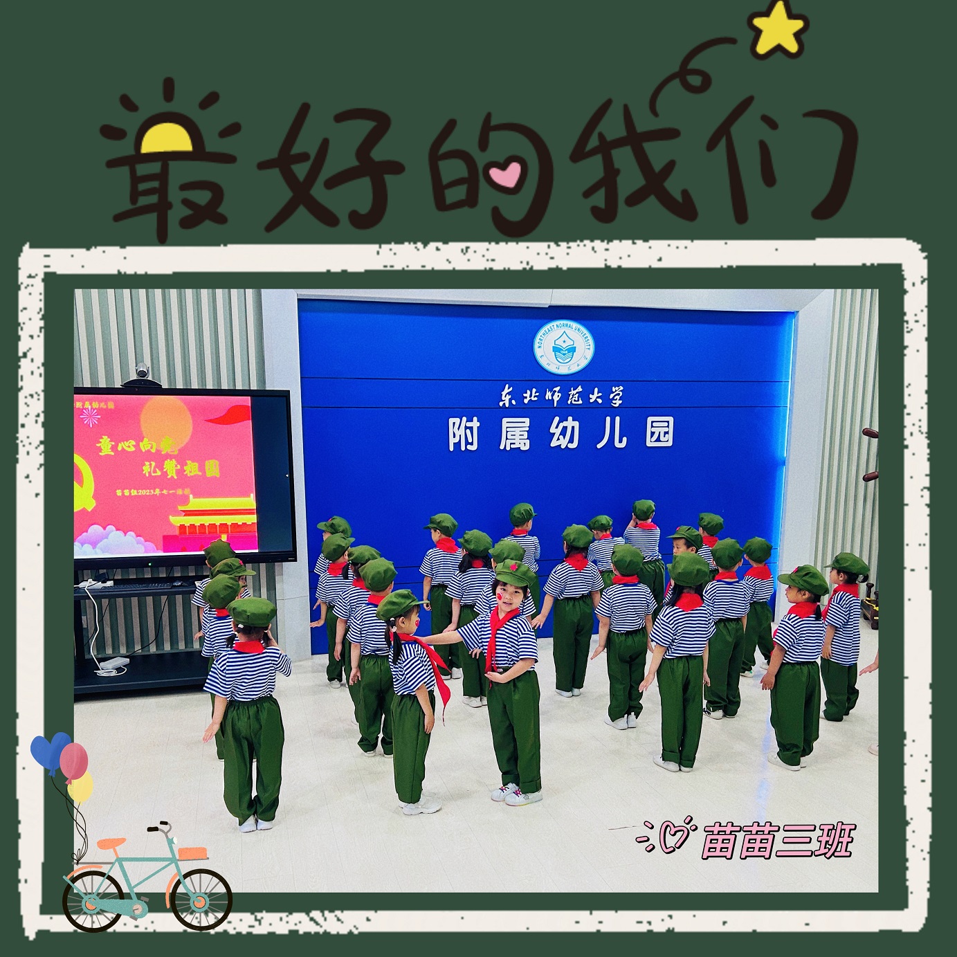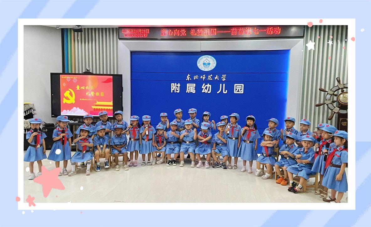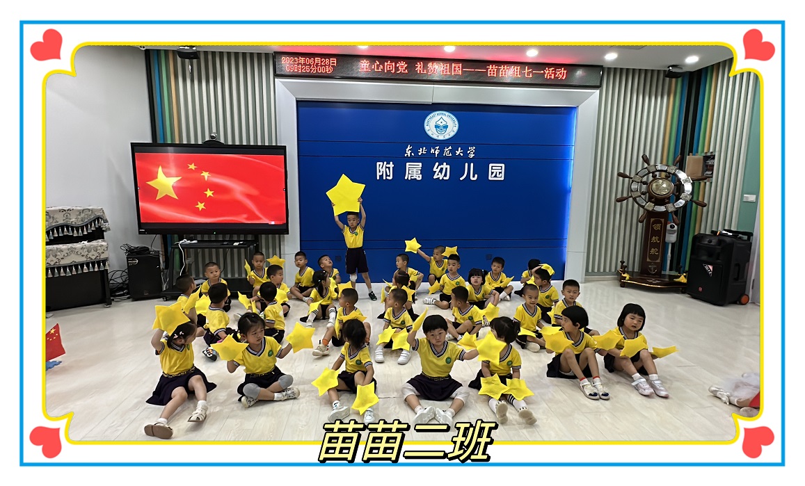 一闪一闪亮晶晶,我们是聪明的小星星;一闪一闪亮晶晶,我们是勇敢的小星星;一闪一闪亮晶晶,我们是国旗上最亮的星。苗苗二班小朋友用稚嫩的声音、可爱的表情、优美的动作,为伟大的党献上一份精彩的礼物。小朋友们从小树立大大的梦想,争做国旗上最亮的星。