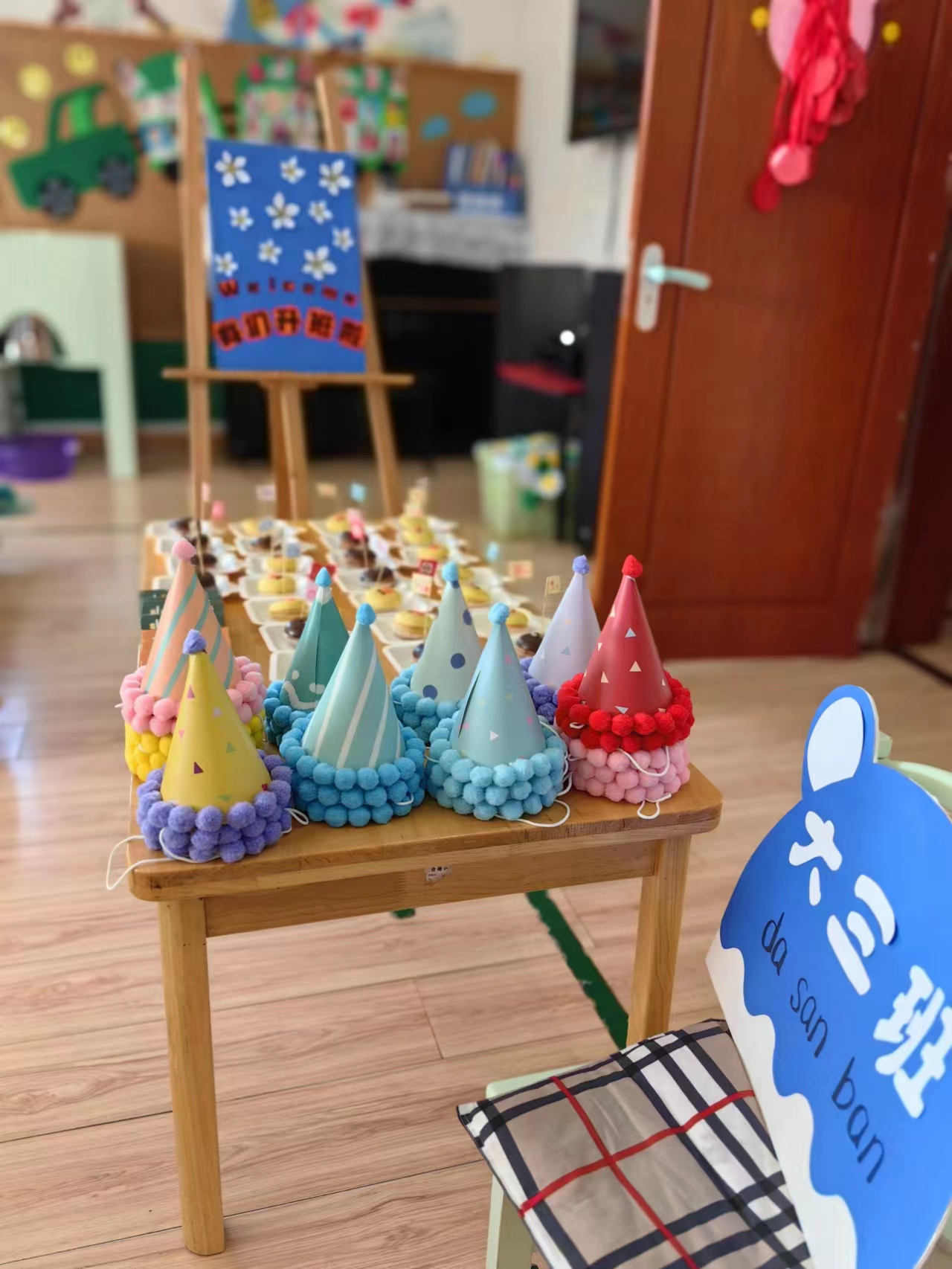 老师正式的为每一位宝贝佩戴果果三班升班奖牌,并且在头上戴上一顶小帽子。真是太可爱了!这么重要的节日怎么少得了喜欢的美食呢!老师在每一个蛋糕上面都插上了对宝贝们祝福,希望宝贝们在新的学年里健健康康、快快乐乐、事事如意。
