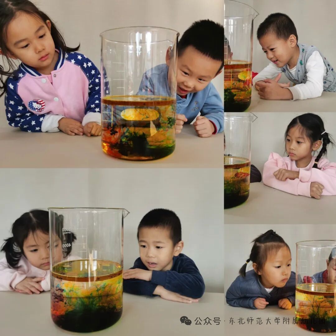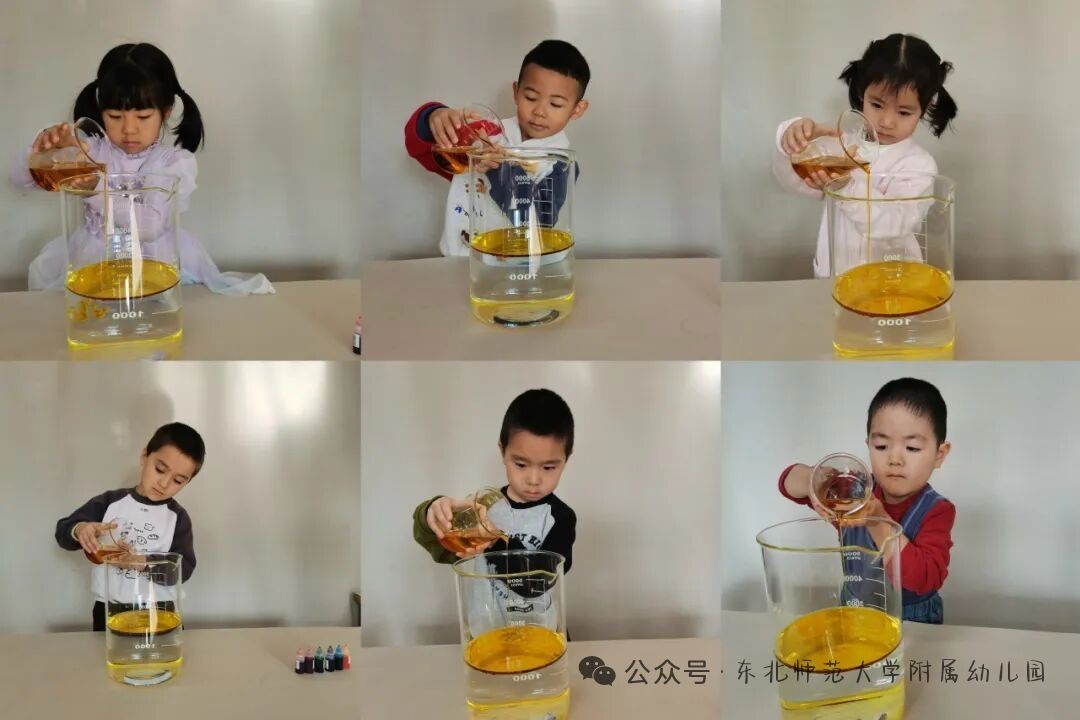 “亲近自然、喜欢探究”在实验中孩子们盯着烧杯的眼神里是主动观察,嘴里“油在上面、颜料在水里”的碎碎念,更是把自己观察的现象变成了自己的小发现,就是这么在玩里长大的~