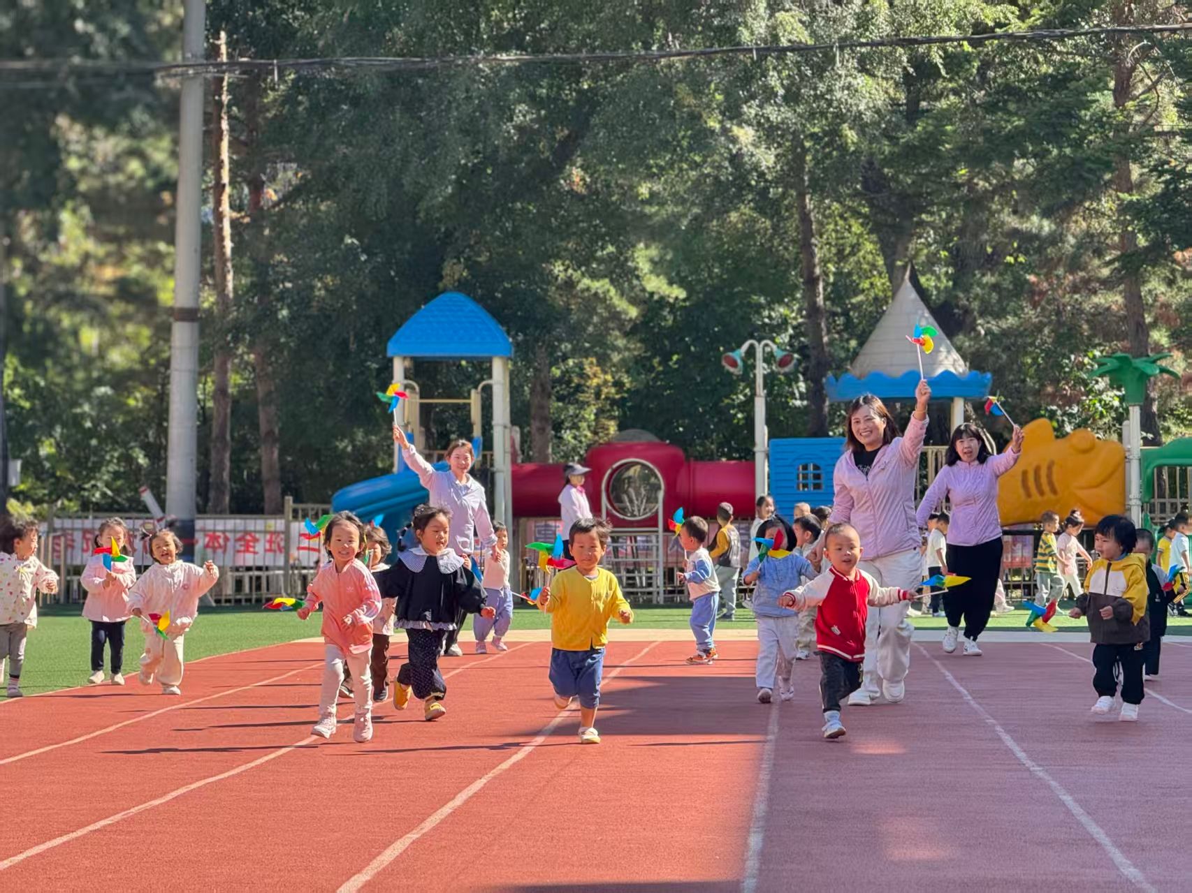 小小班幼儿,正处于社交与互动能力萌芽阶段,在各种趣味游戏里,萌娃们从懵懂被动到主动互动,逐渐展现出不同的类型:从《拉火车》时跟着大人被动参与,到《追逐小风车》因好玩儿主动凑一块儿;从《积木邻里搭》各玩各的,到《一起整理玩具》的任务驱动式,同伴们互动就像小种子慢慢发芽,萌娃们在游戏里一点点长大,慢慢体会到小伙伴共同玩耍的快乐。